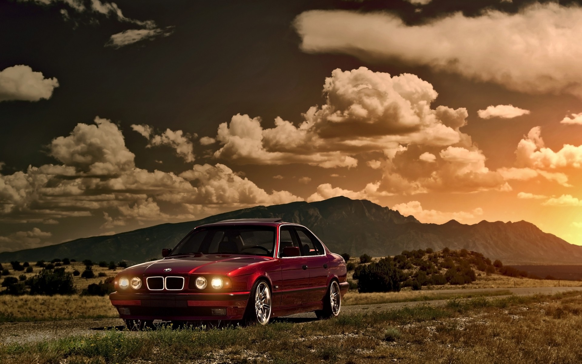 Description: A red car parked on a dirt road in front of a mountain range at sunset with clouds in the sky.