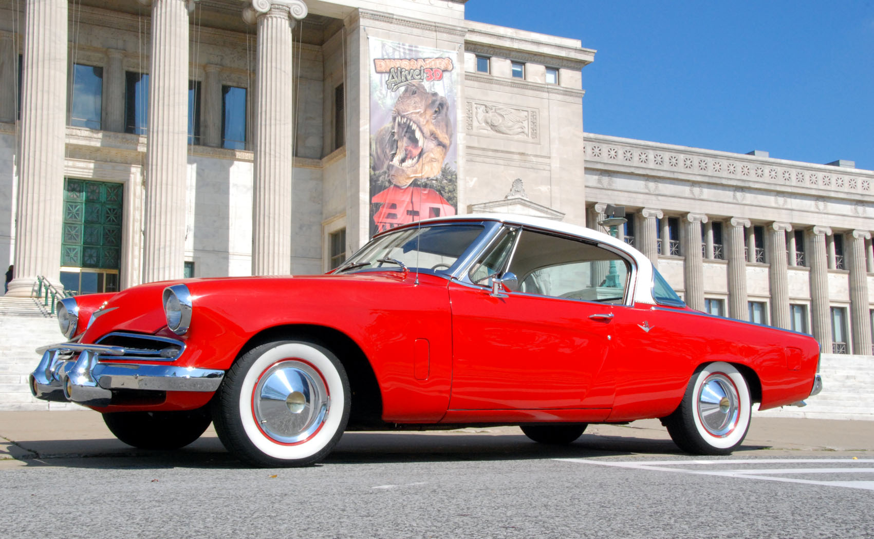 Description: A red car parked in front of a building with columns on the side of it and a large poster on the side of the building.