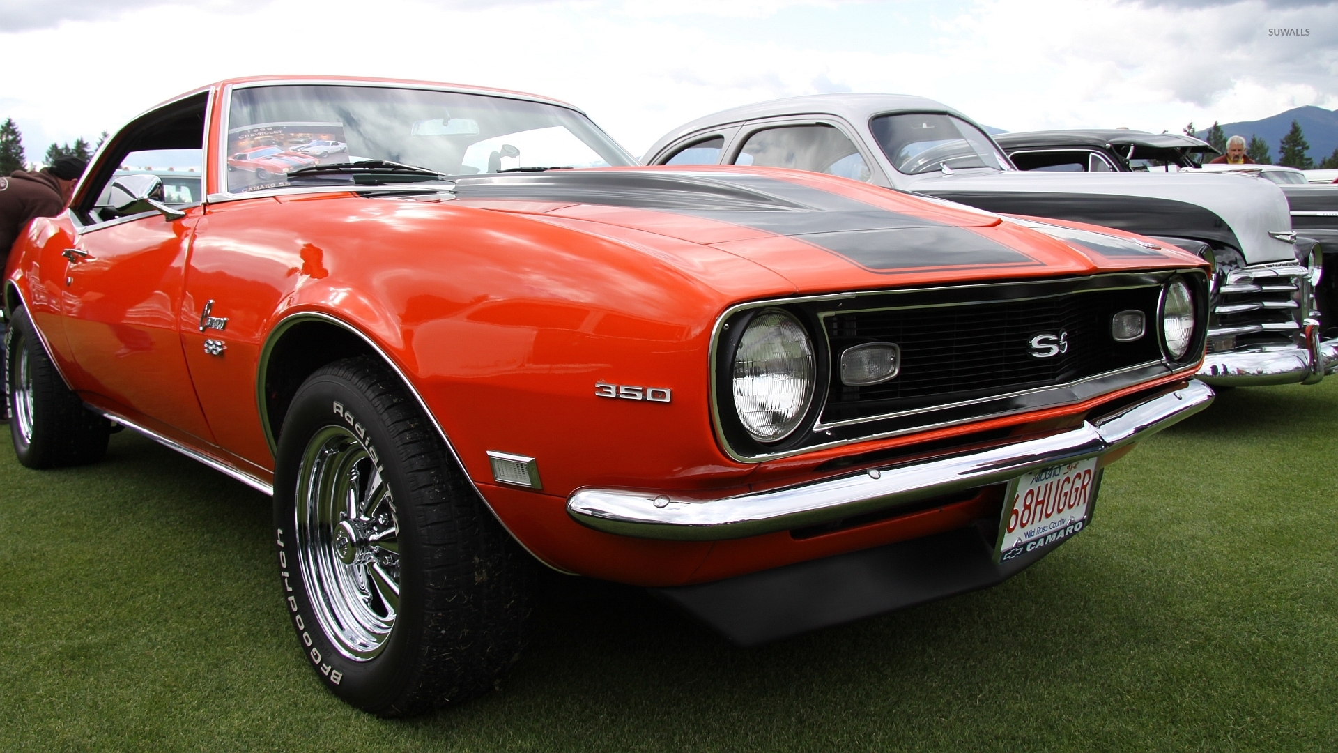 Description: A red car parked on top of a lush green field next to other cars on display at a car show.