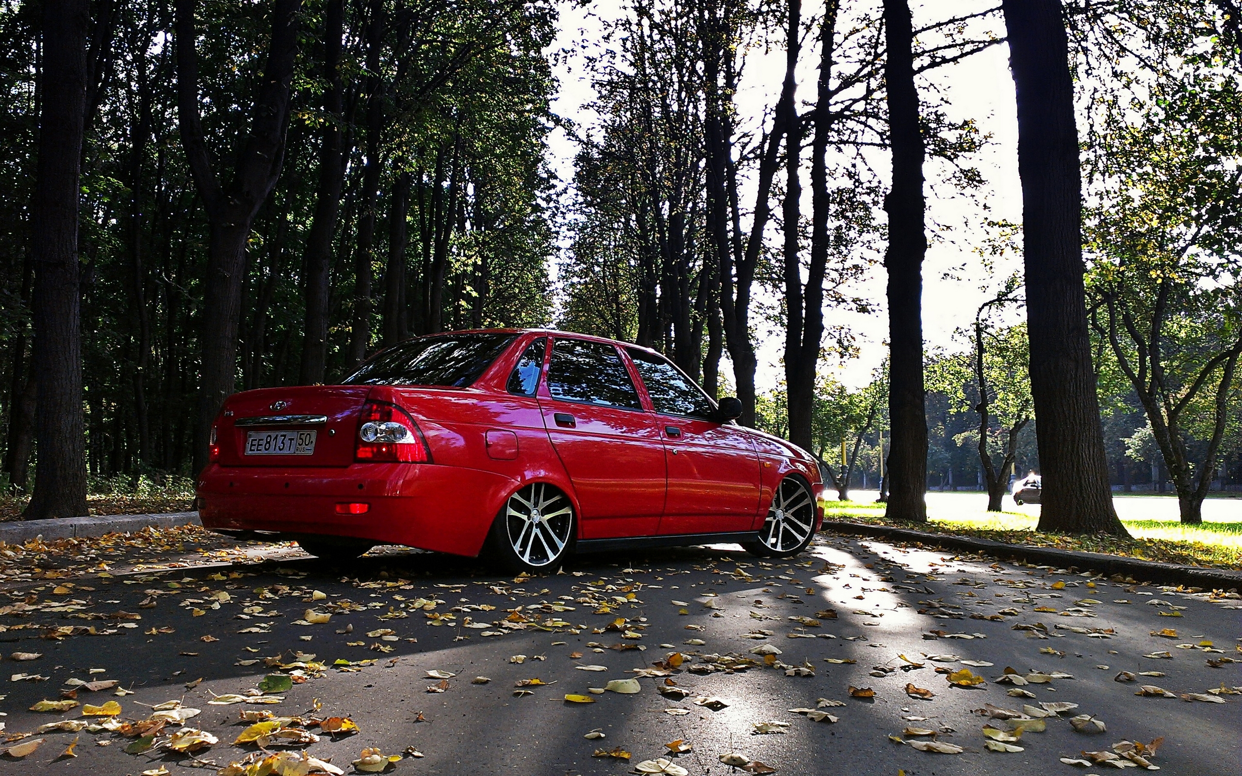 Description: A red car parked on the side of a road in a park with trees and leaves on the ground.