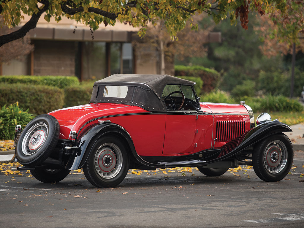 Description: A red car parked on the side of a road next to a tree and bushes with leaves on it.