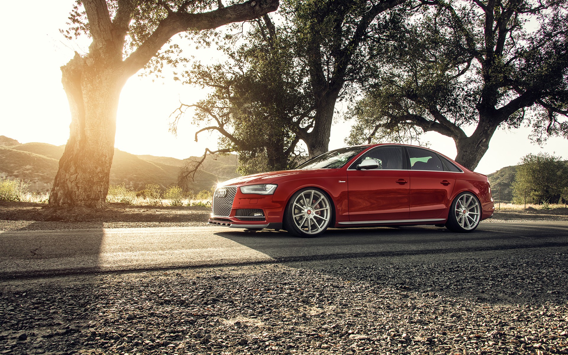 Description: A red car parked on the side of a road next to trees and a hill in the background with sun shining on the ground.