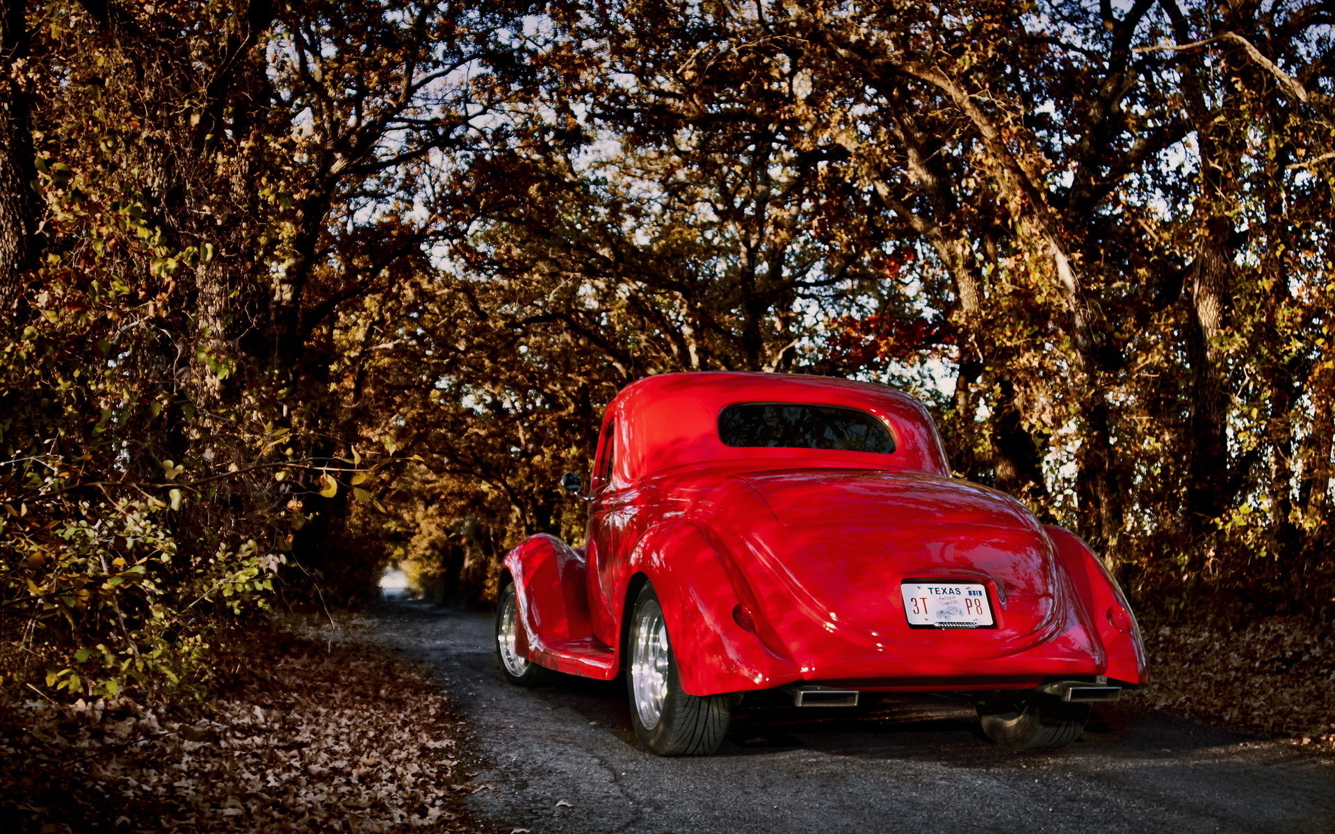 Description: A red car is parked on a road in the woods near trees and bushes.