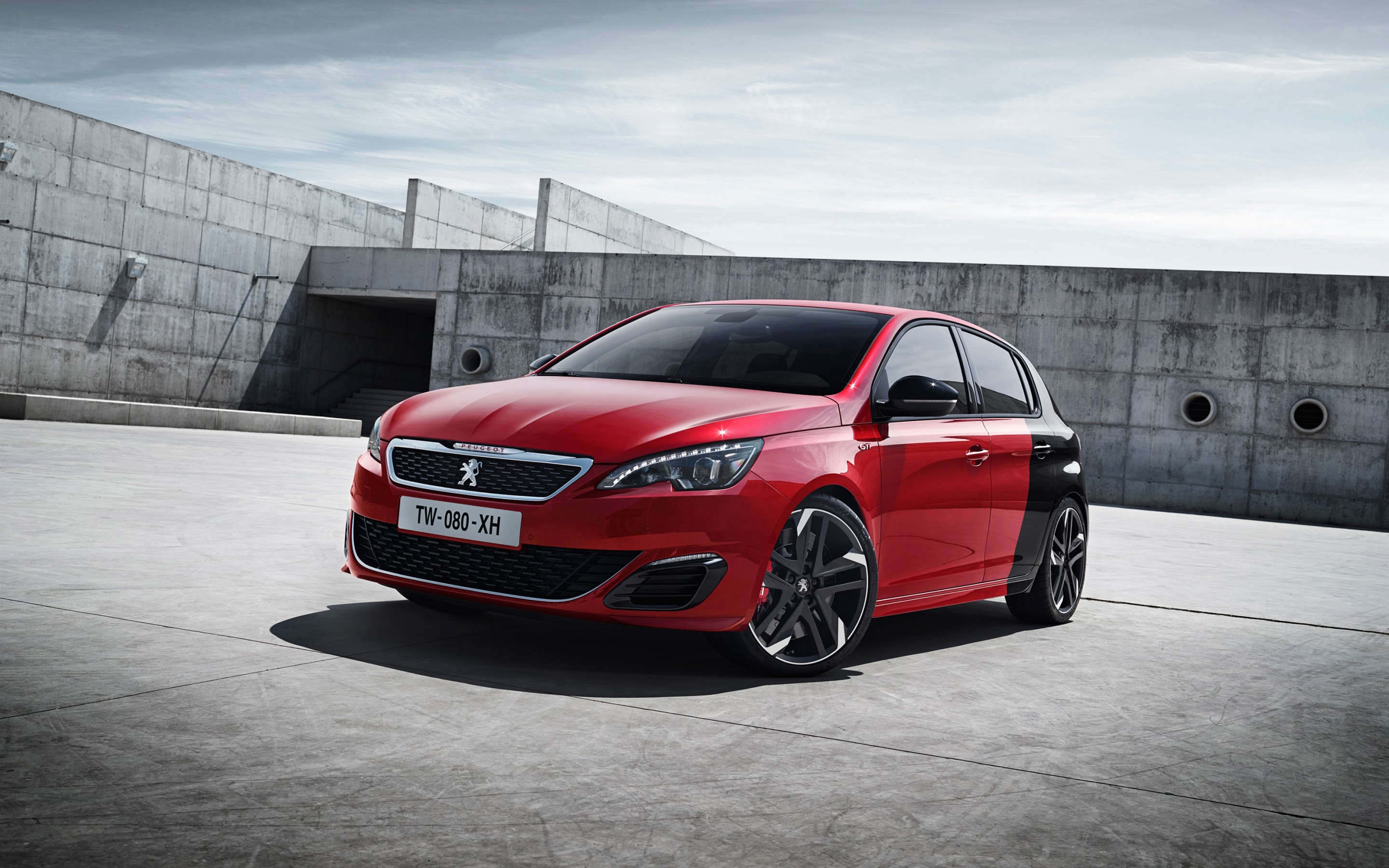 Description: A red car parked in a parking lot next to a building with a concrete wall behind it and a concrete walkway.
