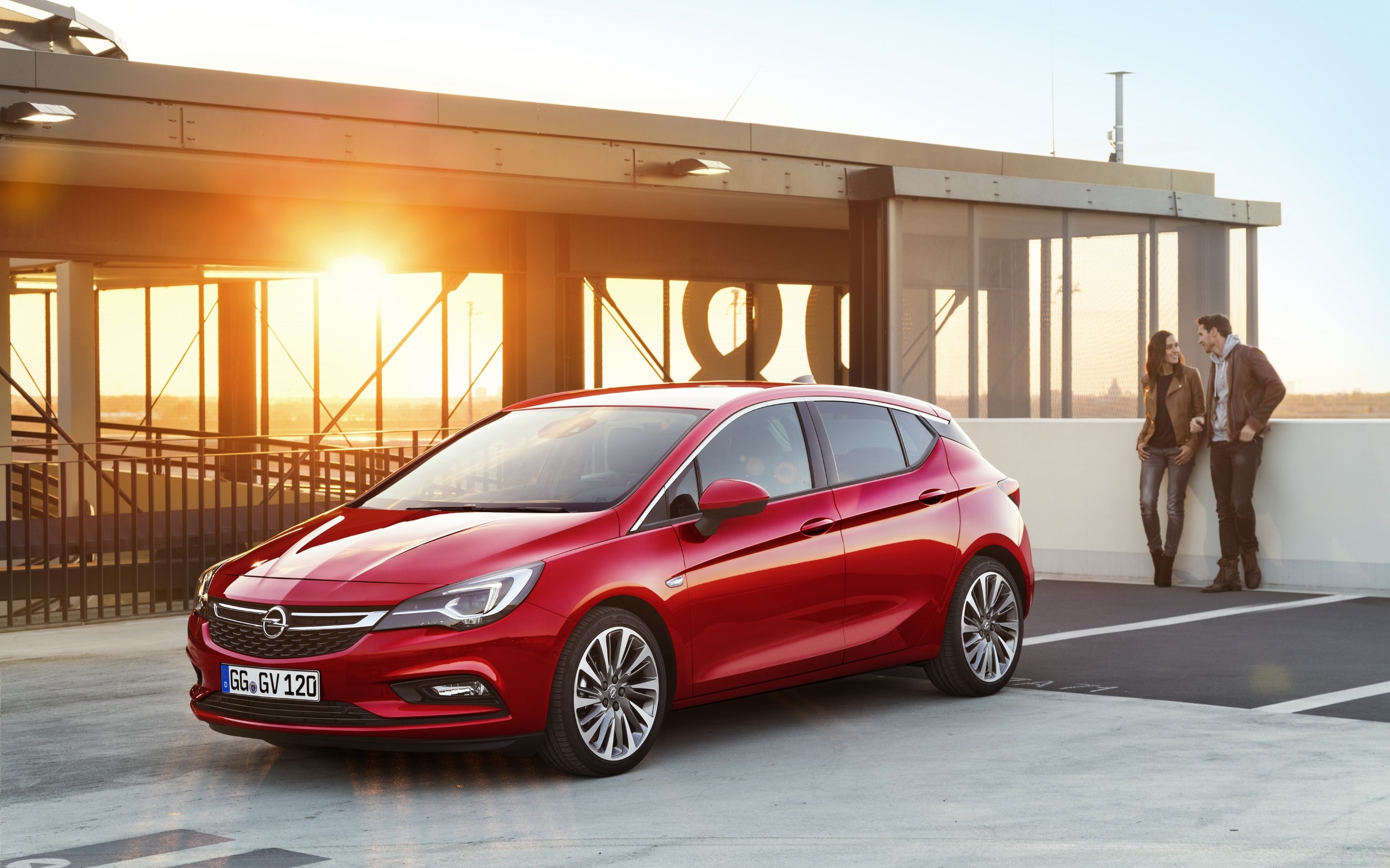 Description: A red car parked in a parking lot next to a building with a man standing next to it and a woman standing next to it.