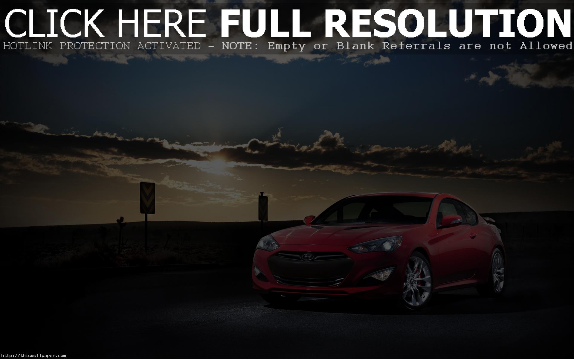 Description: A red car parked in a parking lot at night with the sun setting behind it and a dark sky.