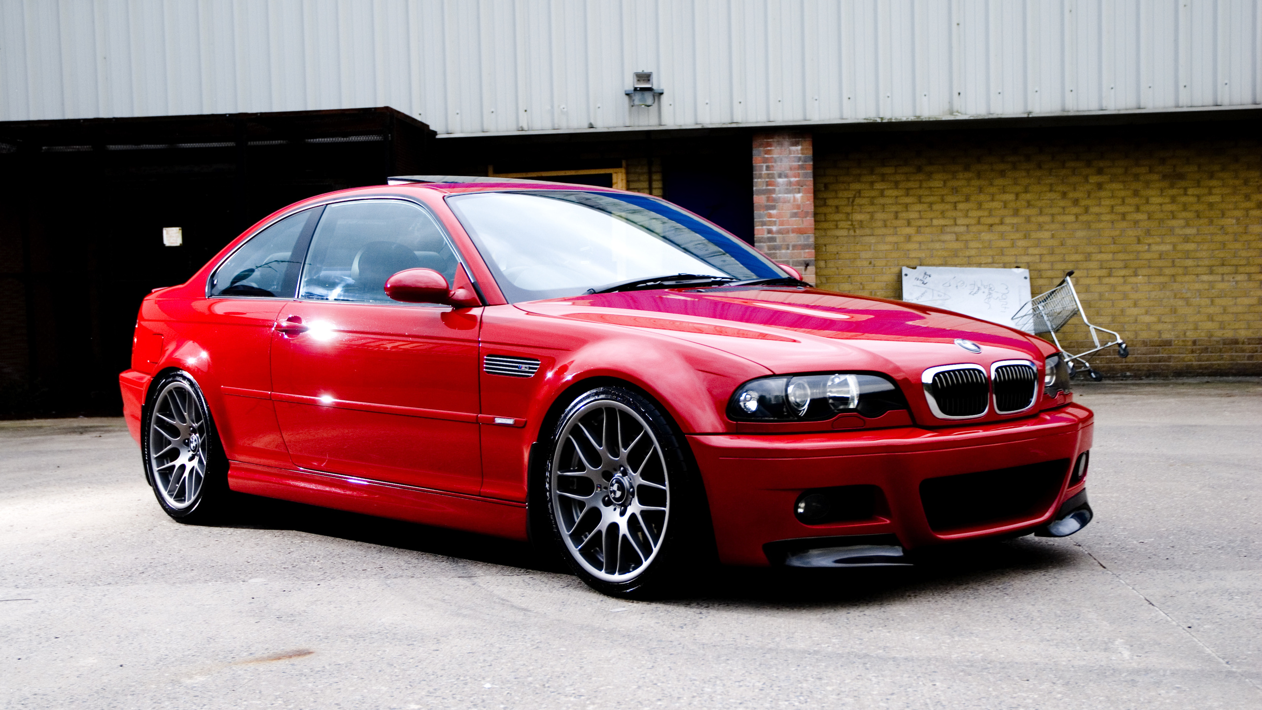 Description: A red car parked in a parking lot next to a building with a bike rack on the front of it.