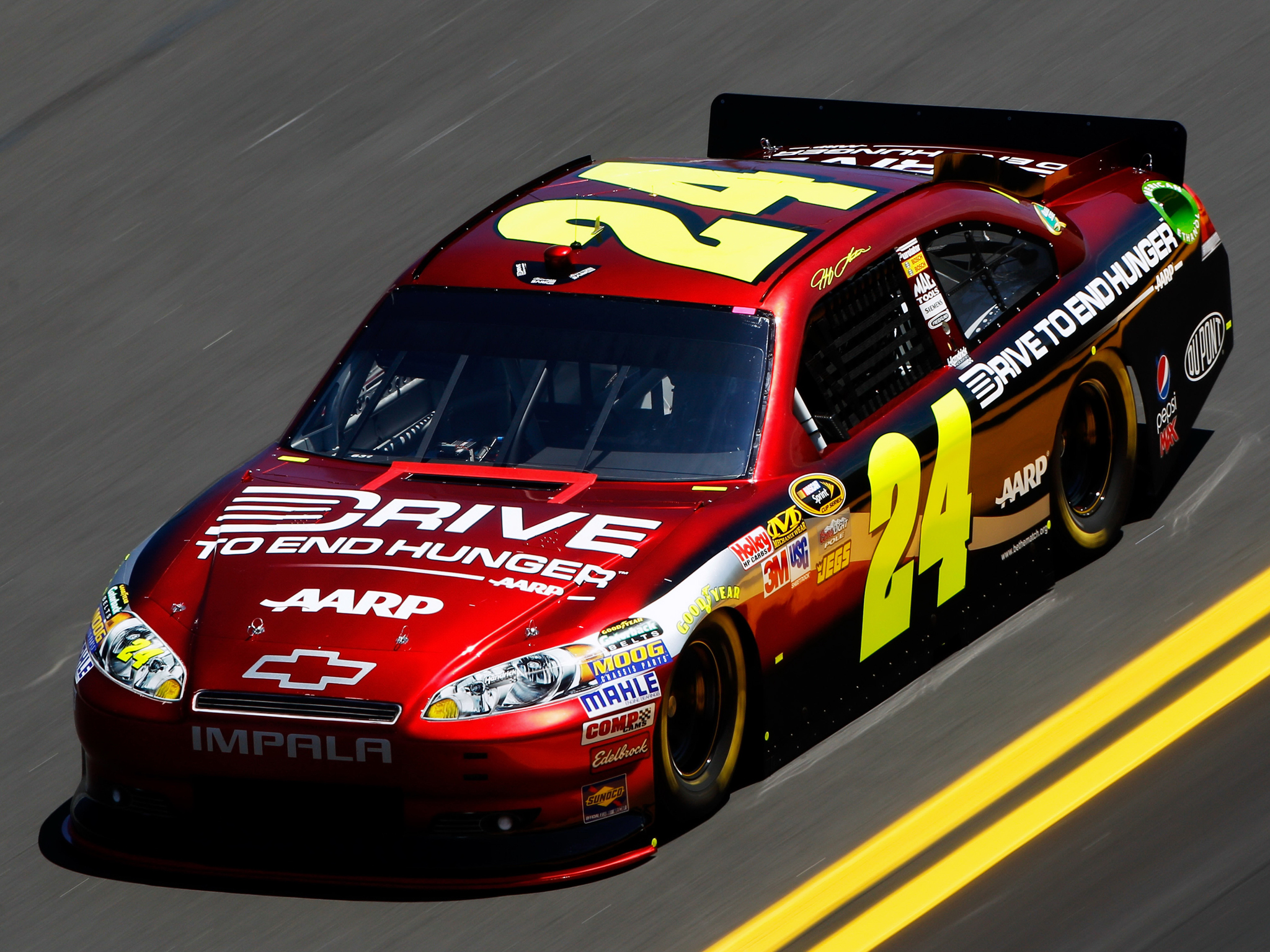 Description: A red car driving down a race track with a number on it's side and a yellow stripe on the side.