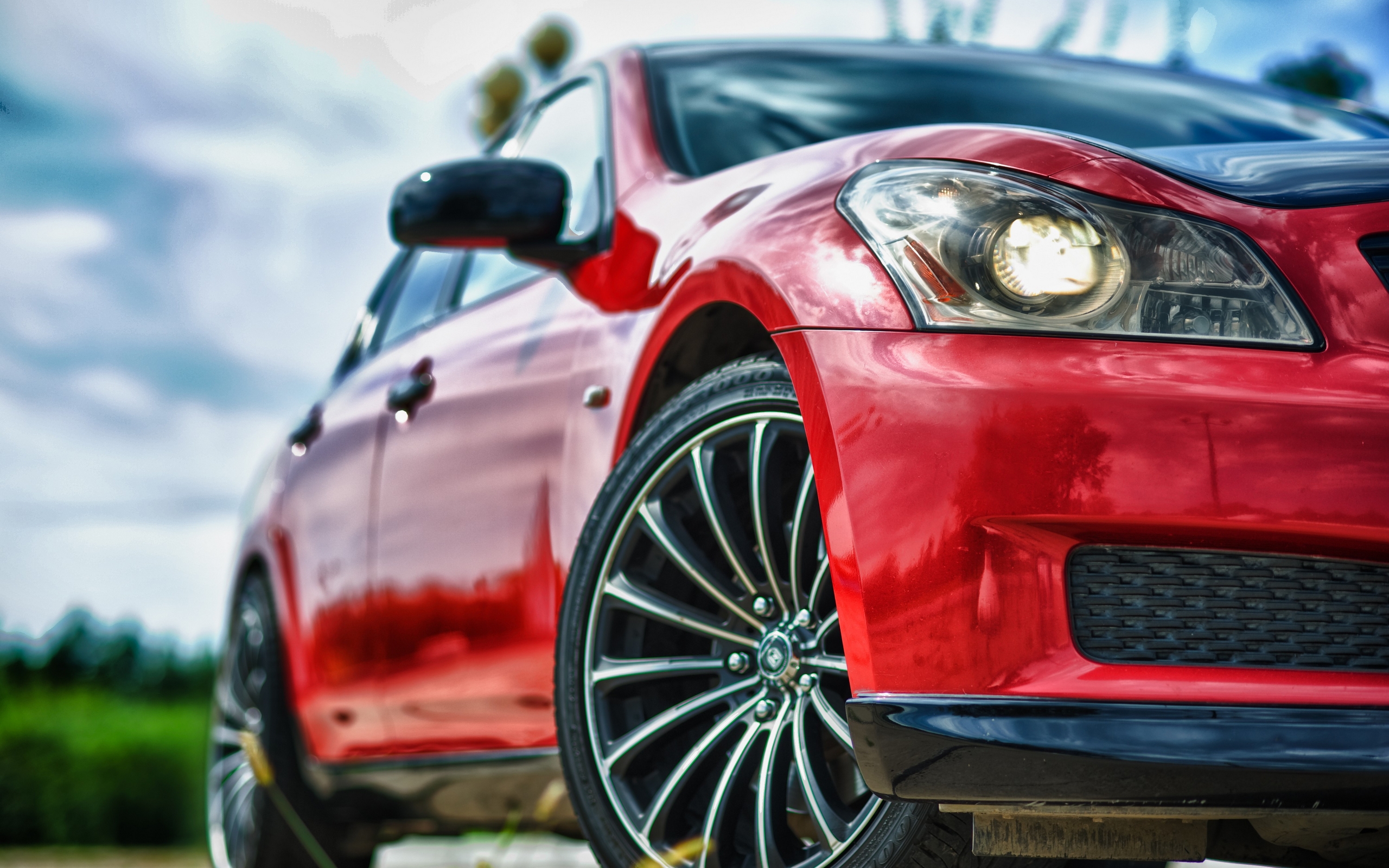 Description: A red car parked on the side of a road with a sky background and clouds in the background.