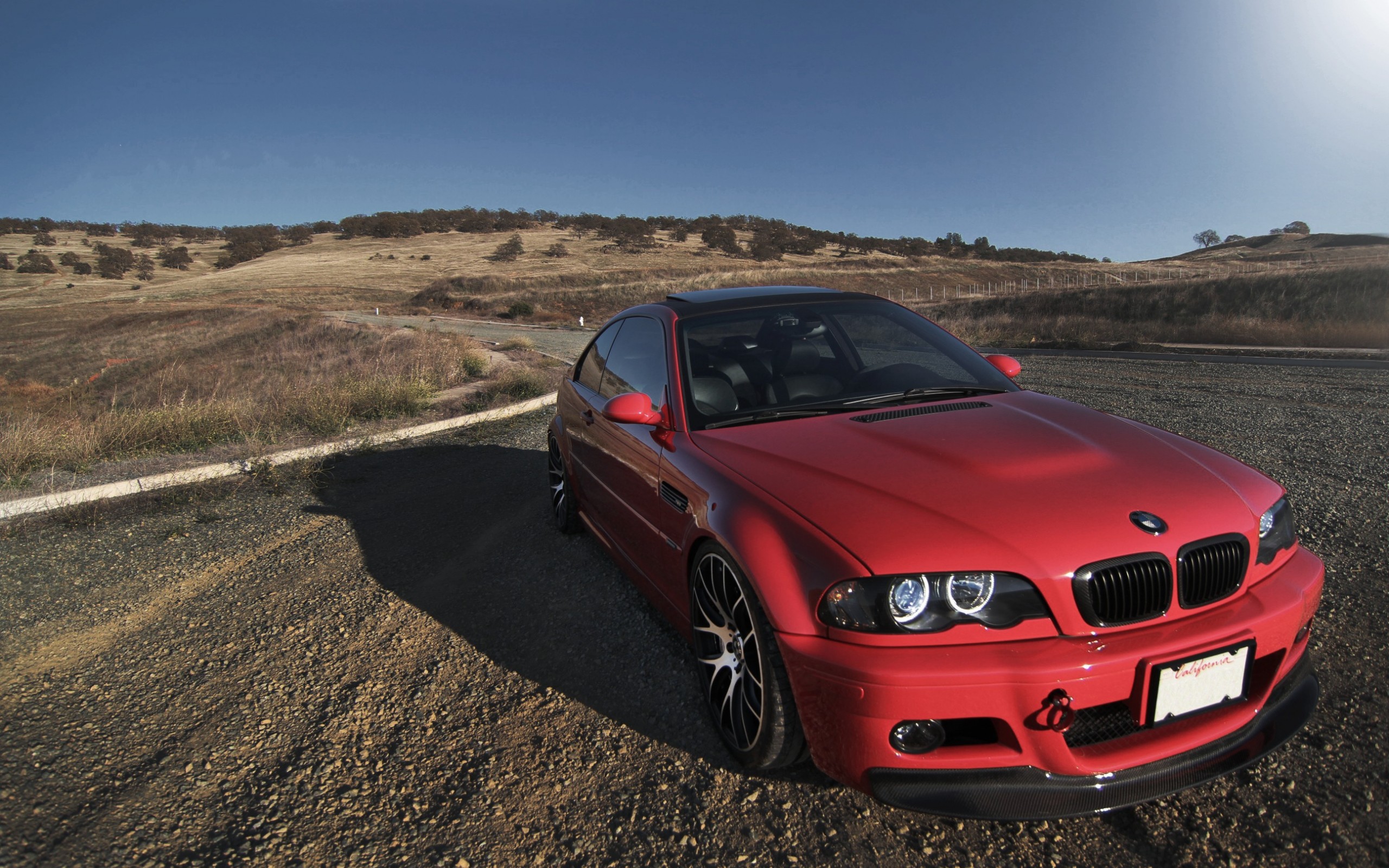 Description: A red car parked on the side of a road near a field and hills in the background with a blue sky.