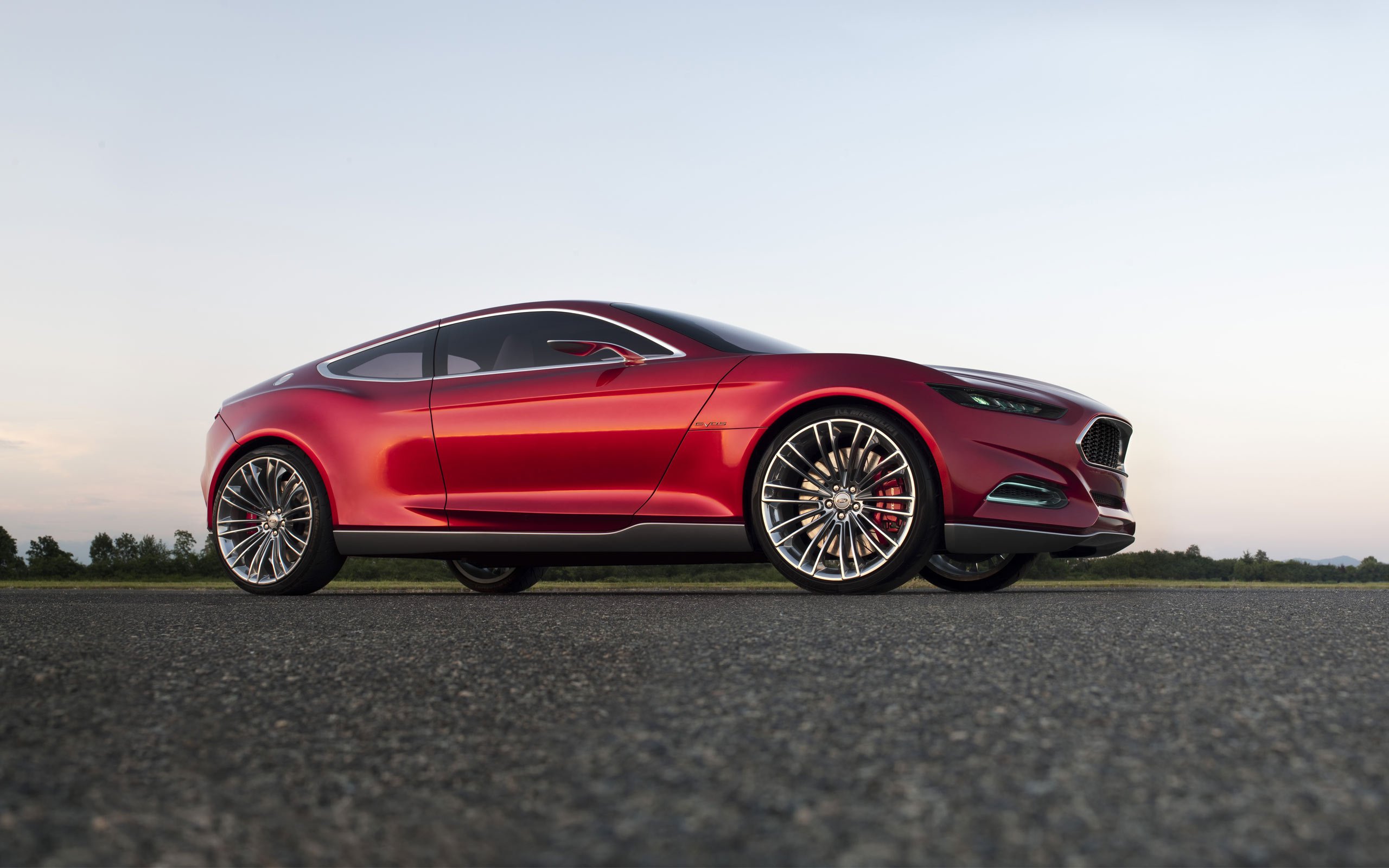 Description: A red car parked on the side of a road next to a field of grass and trees in the background.