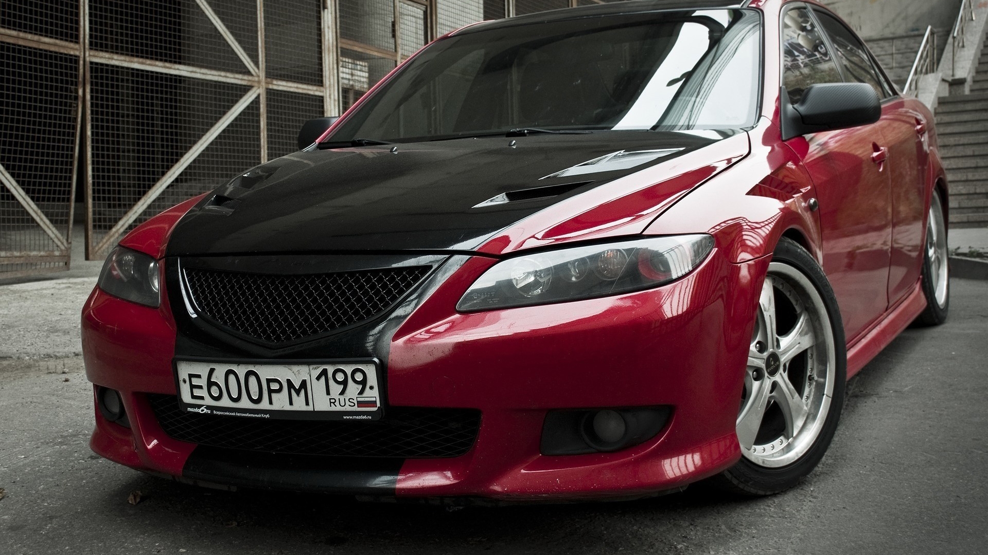 Description: A red car parked on the side of a street next to a building with a sign on it that says.