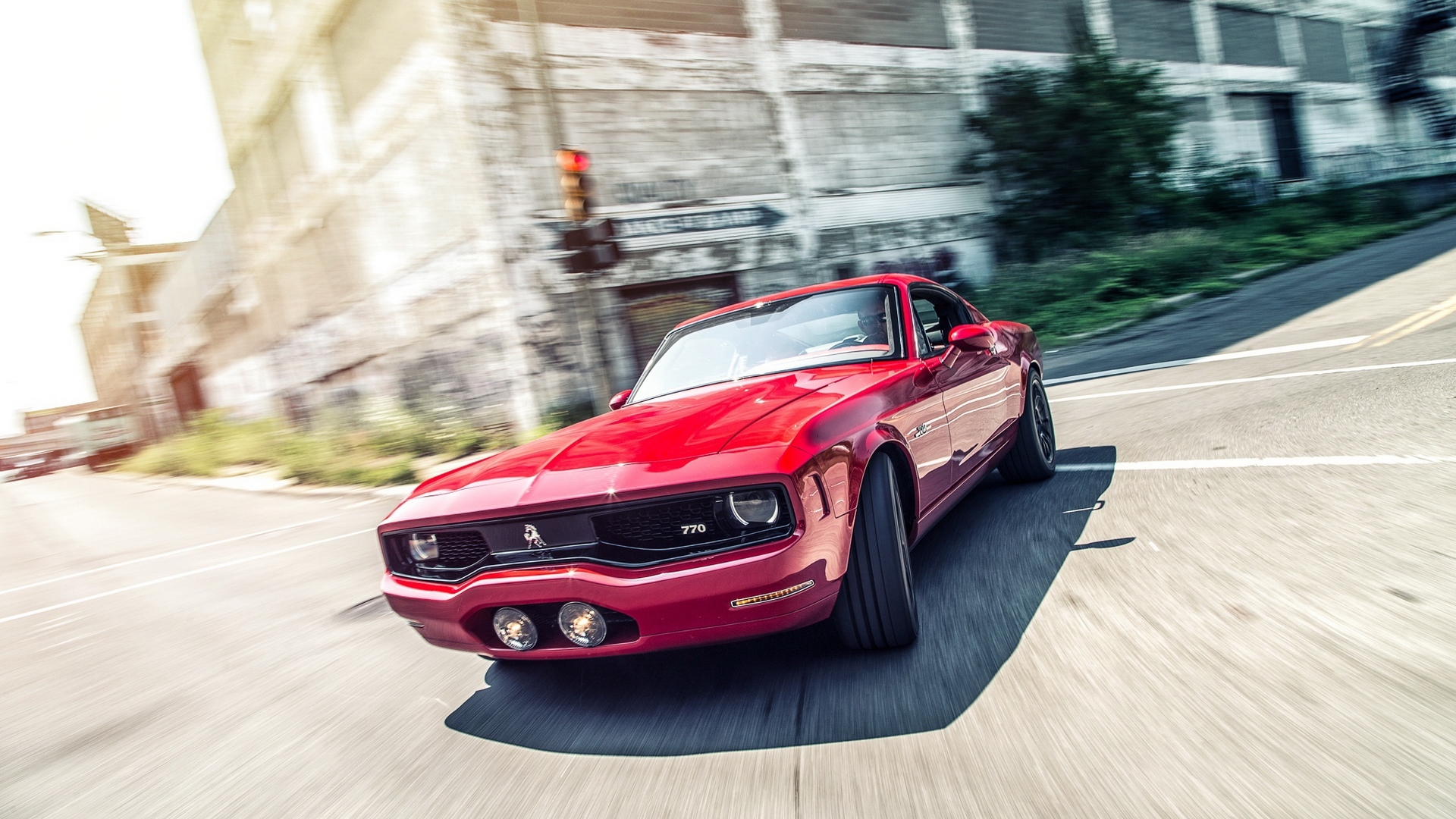 Description: A red car driving down a street next to a building and a traffic light on a street sign that says no parking.