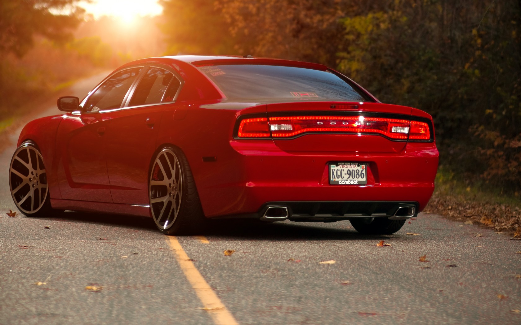 Description: A red car parked on the side of a road with the sun shining behind it and trees in the background.