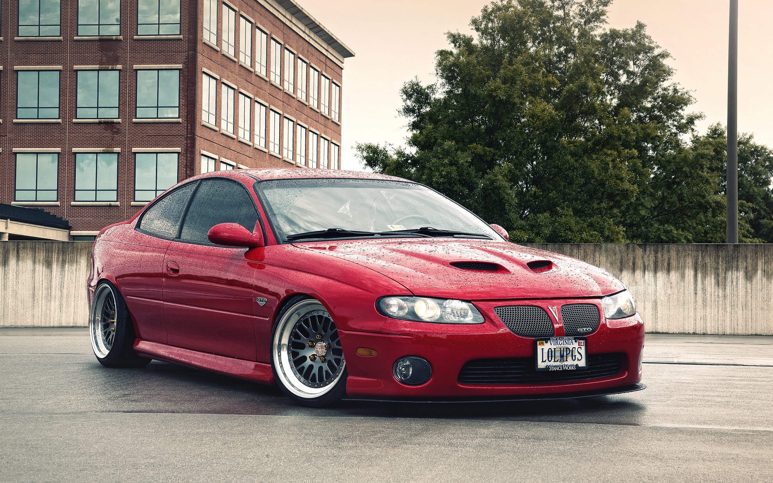 Description: A red car parked in front of a tall building with a lot of windows on it's side.