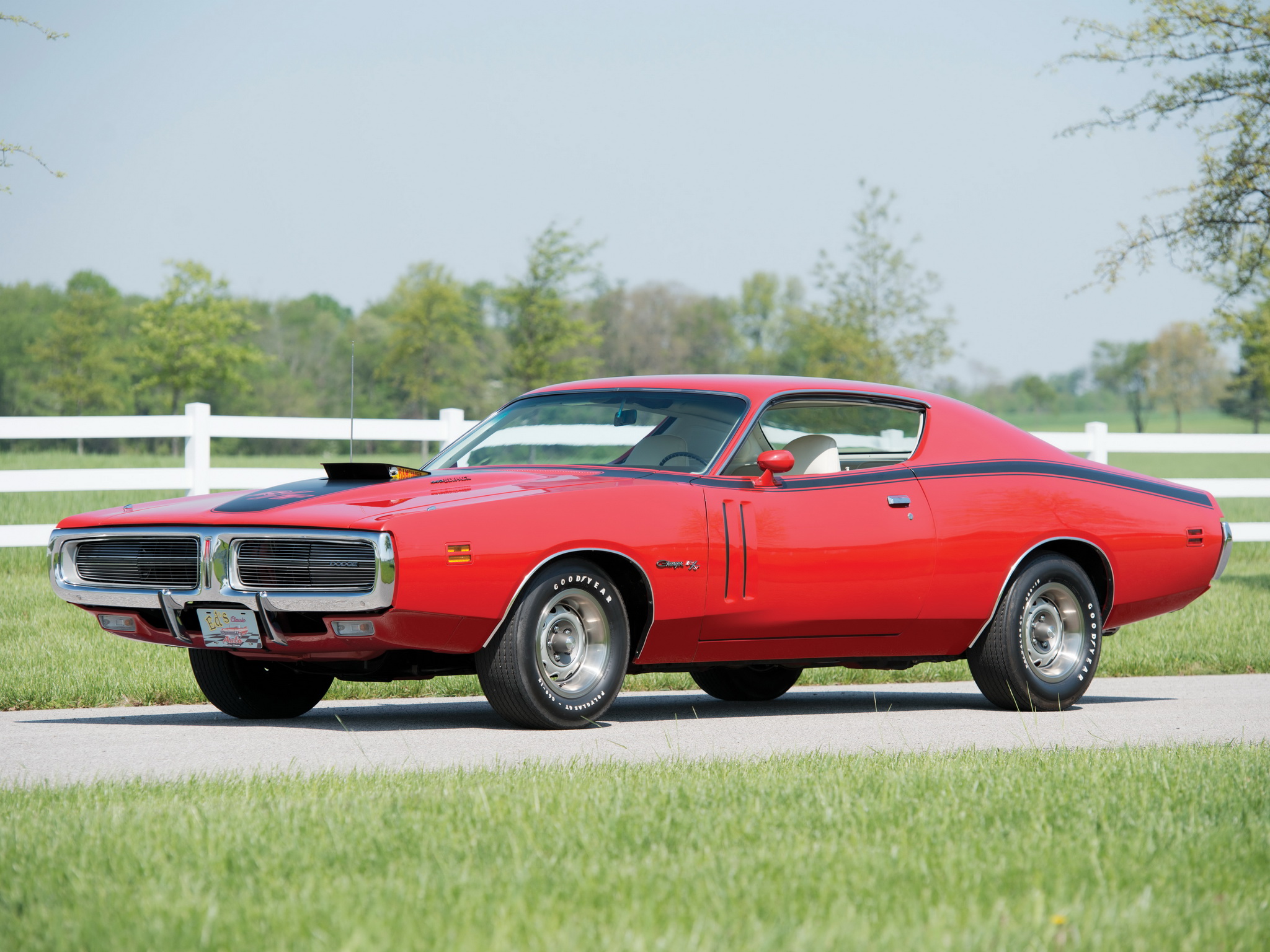 Description: A red car parked on a road next to a white fence and grass field with trees in the background.