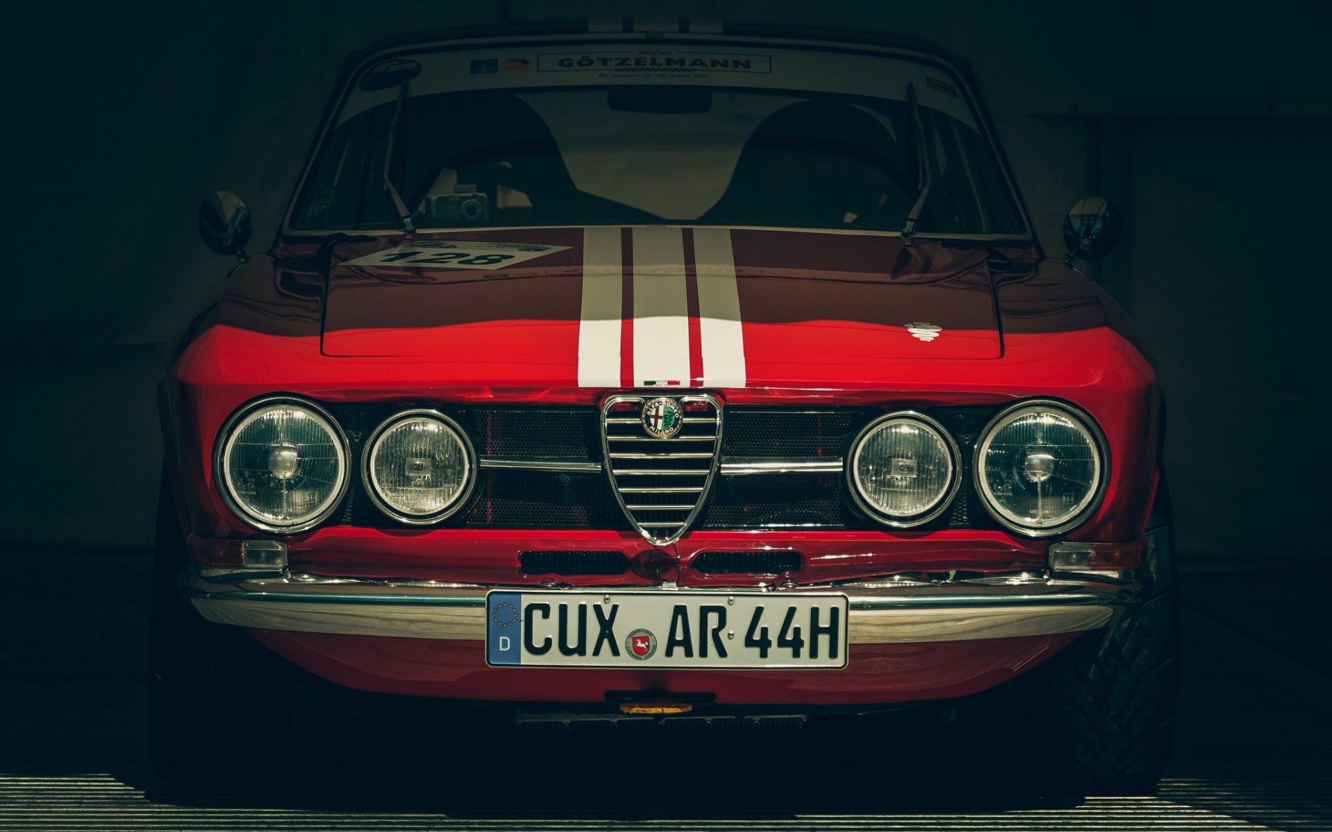 Description: A red car with a white stripe on it's front bumper and a white stripe on the front bumper.