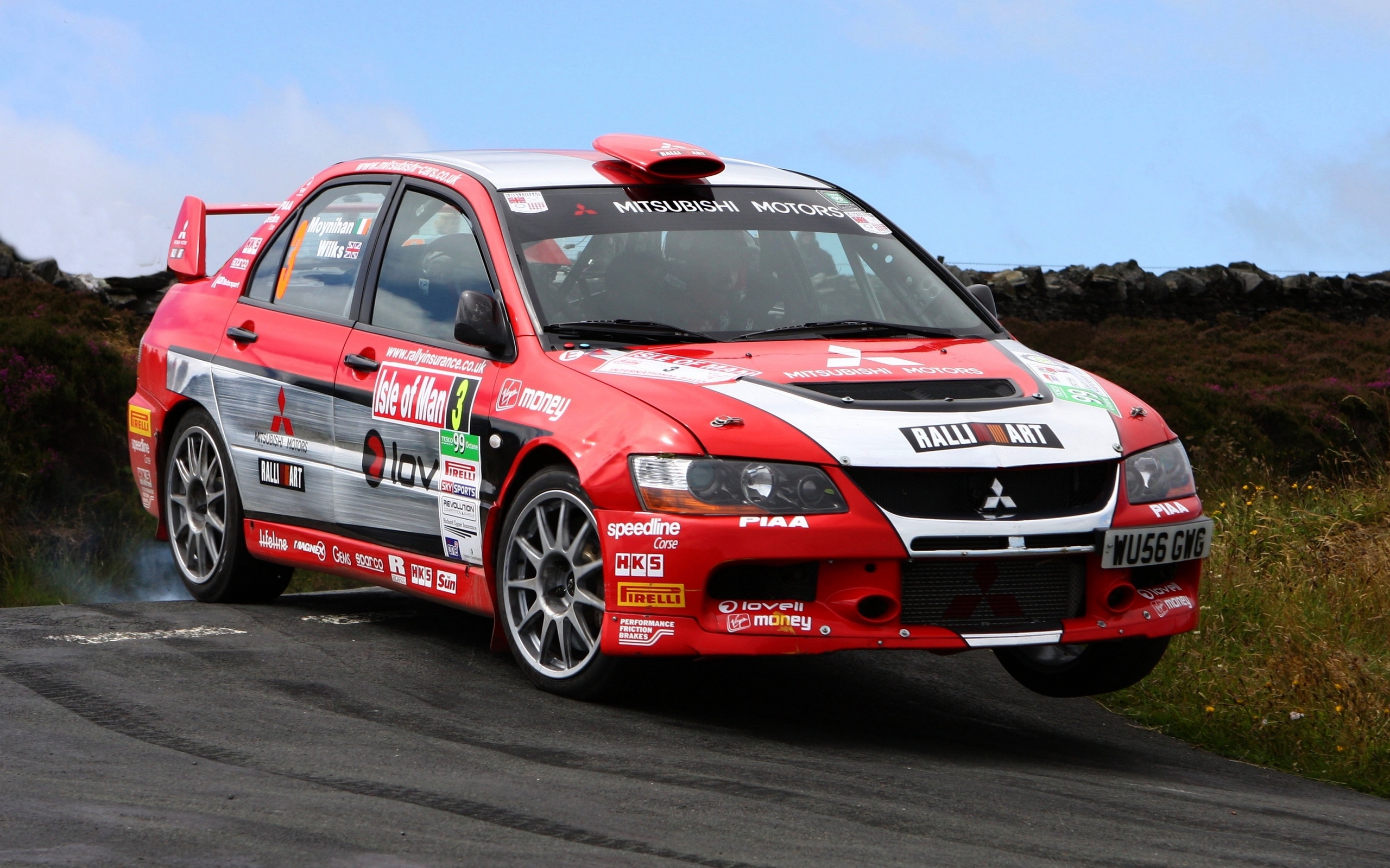 Description: A red car with a white stripe driving down a road with a sky background and grass and bushes behind it.