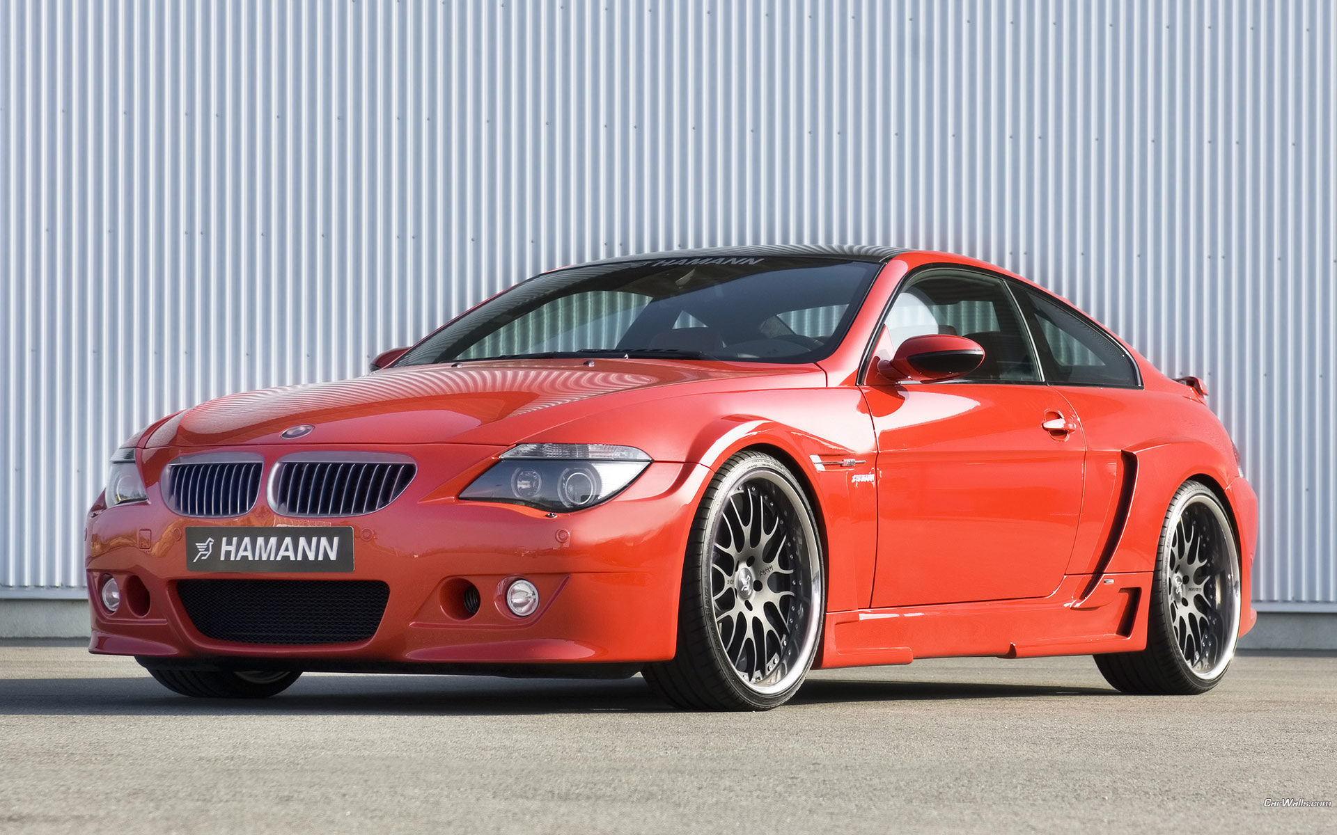 Description: A red car parked in front of a building with a white wall behind it and a black car parked in front of it.