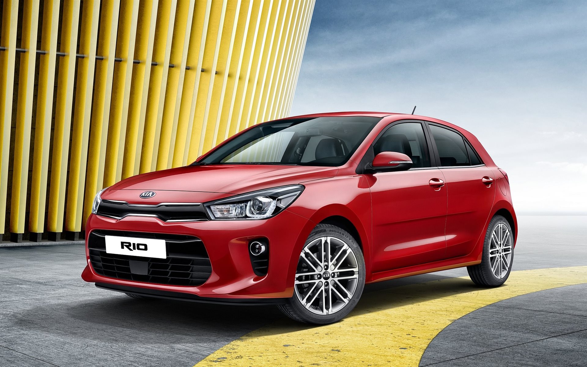 Description: A red car parked in front of a yellow building with a yellow wall behind it and a yellow and white sign.