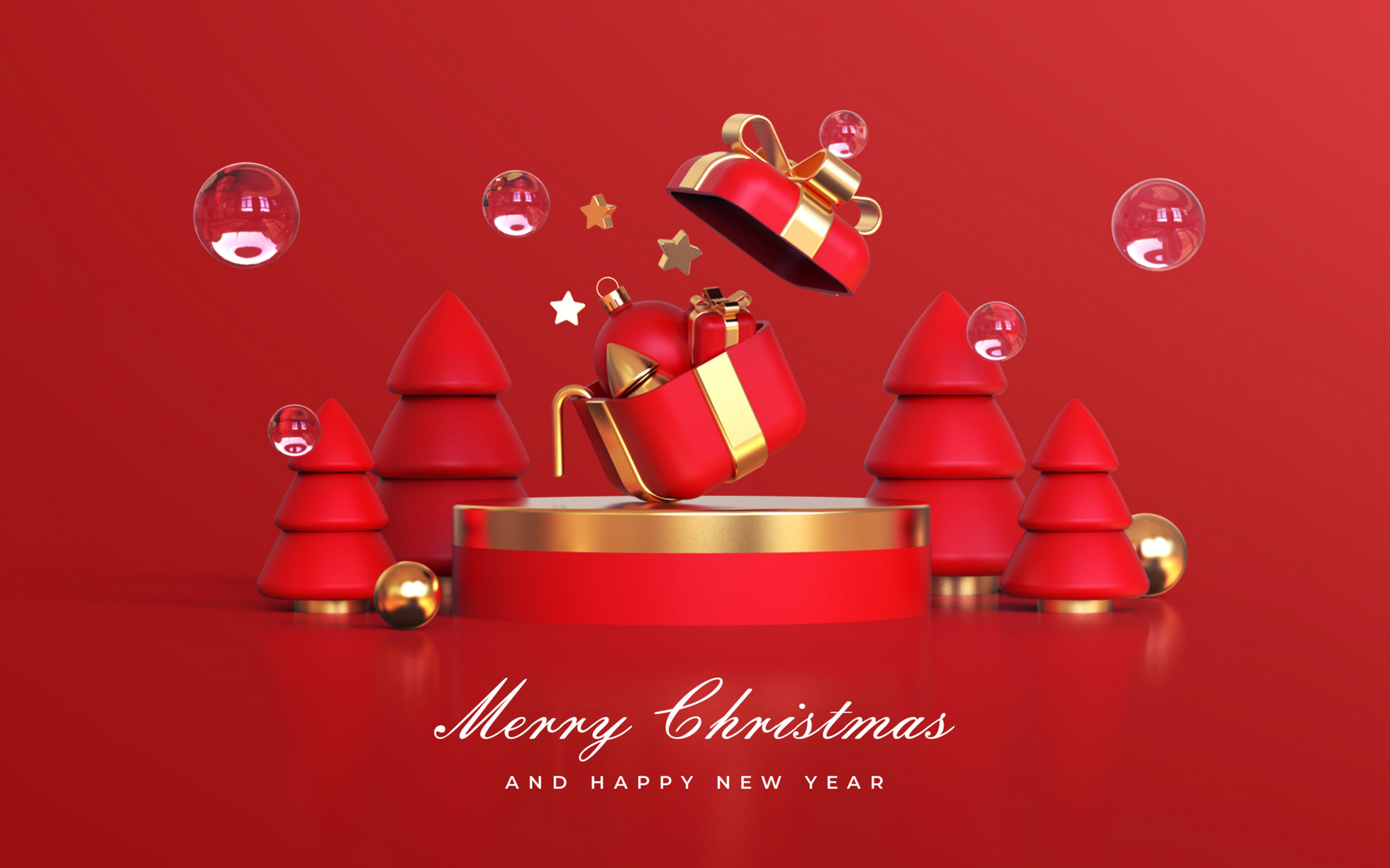 Description: A red christmas card with a gold ribbon and a red background with a red christmas tree and a red gift box.