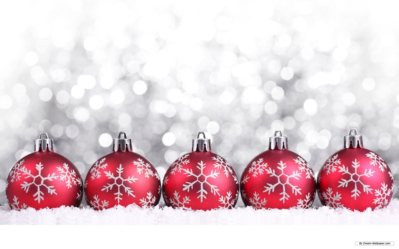 Description: A row of red christmas ornaments sitting on top of a snow covered ground with a silver background and boke of lights.