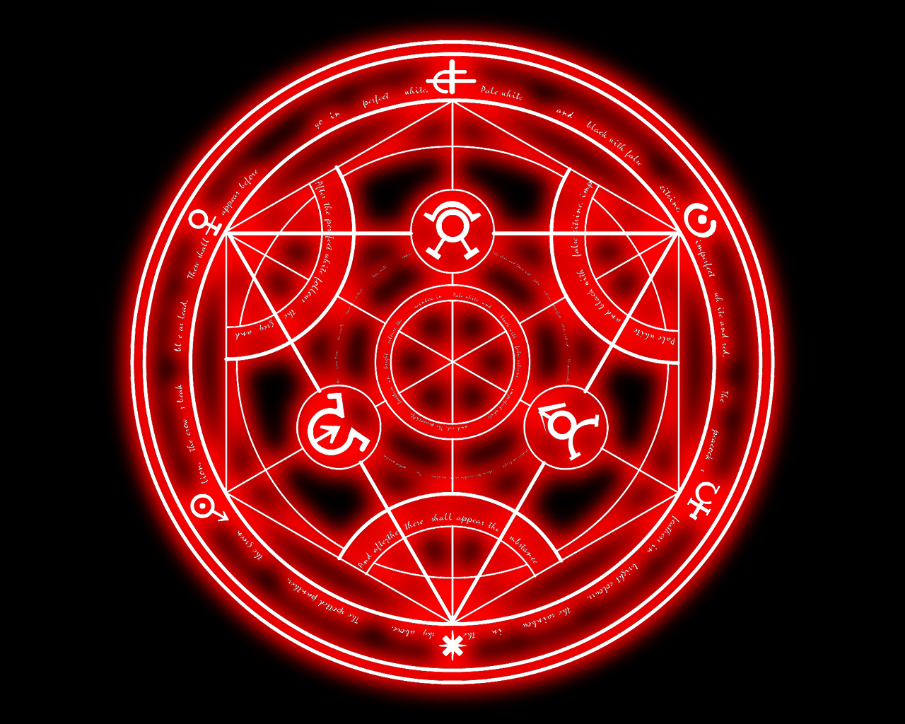 Description: A red circle with symbols in it on a black background with a red glow in the middle of the circle.