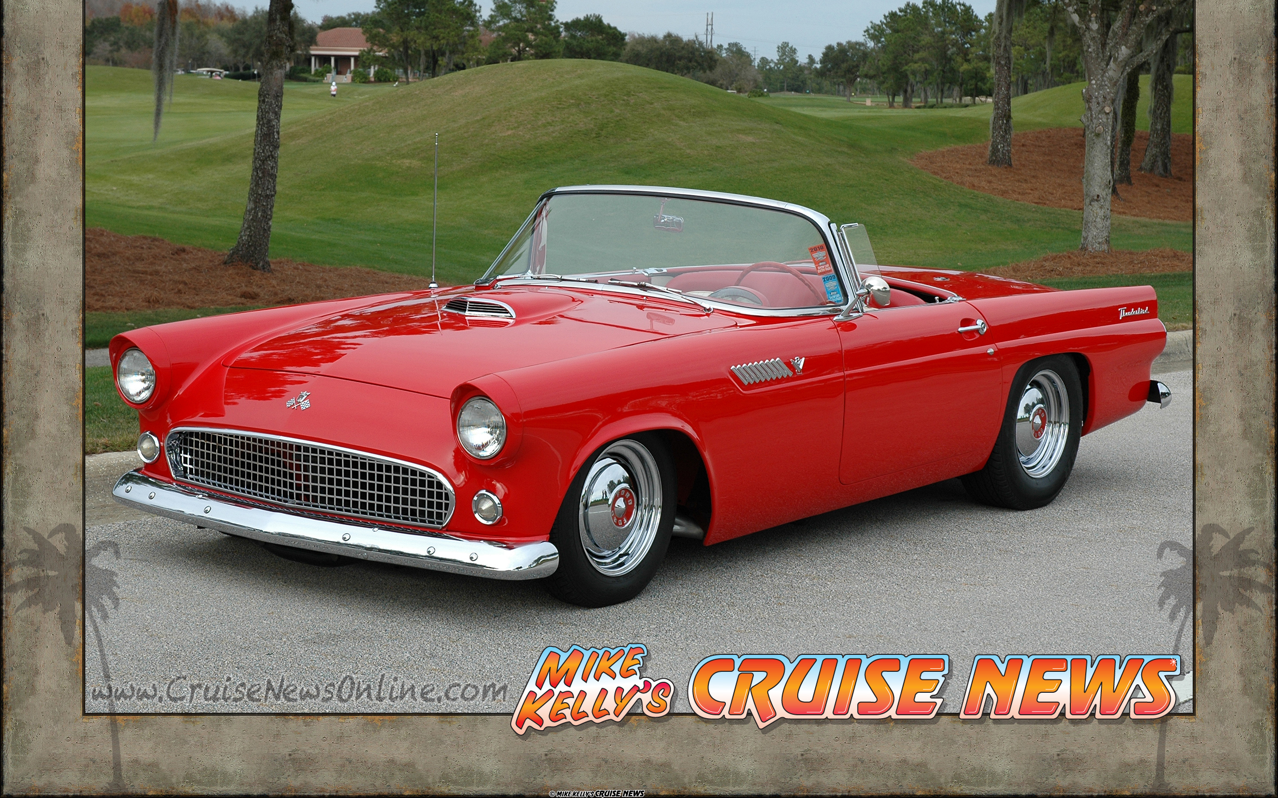 Description: A red classic car parked in a driveway next to a green field and trees with a golf course in the background.