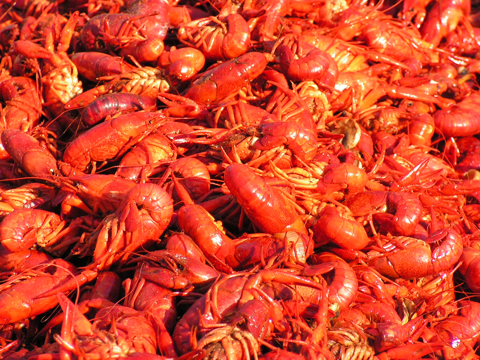 Description: A pile of red craws sitting on top of a pile of grass next to each other on a field.