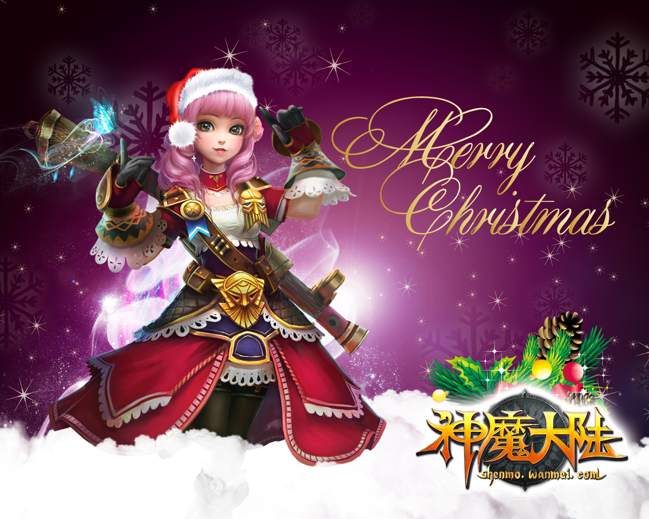 Description: A girl in a red dress holding a gun and a christmas tree in the background with snowflakes.