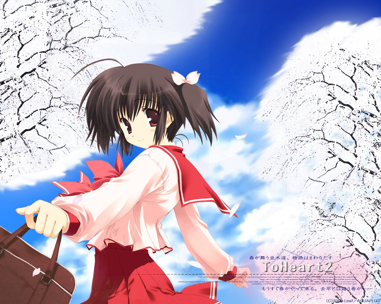 Description: A woman in a red dress carrying a brown suitcase in a snowy landscape with trees and clouds in the background.