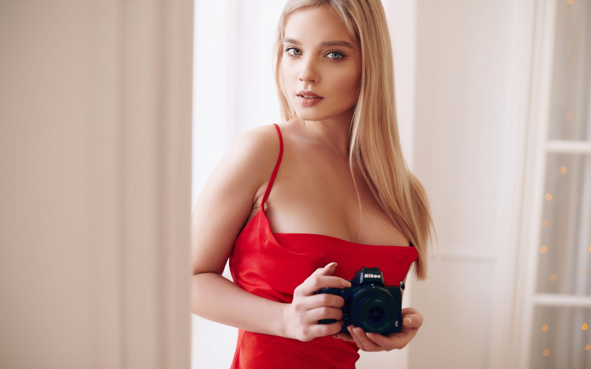 Description: A woman in a red dress holding a camera in her hand and looking at the camera with a smile on her face.