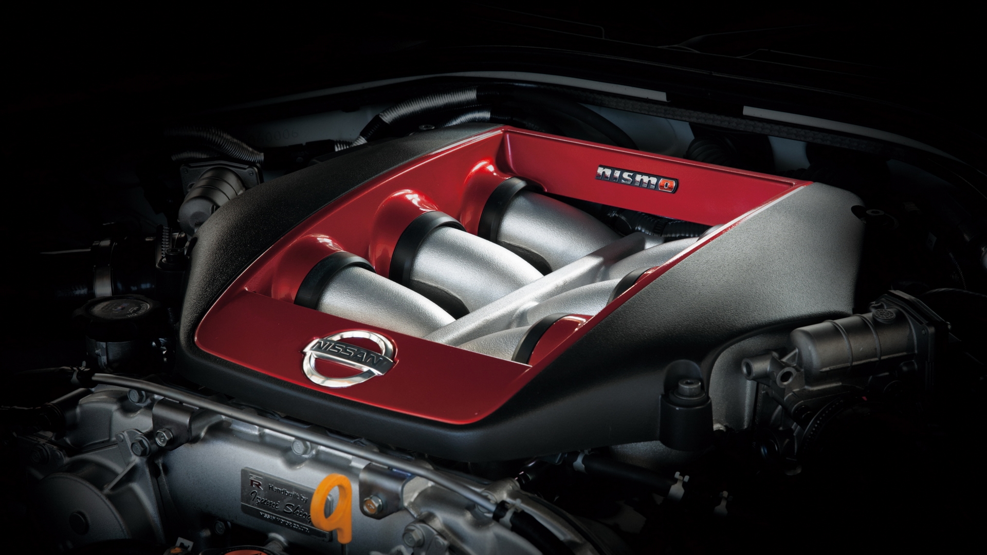 Description: A red engine with two exhaust pipes and a black background with a white and red logo on it and a black background with a red and white logo.