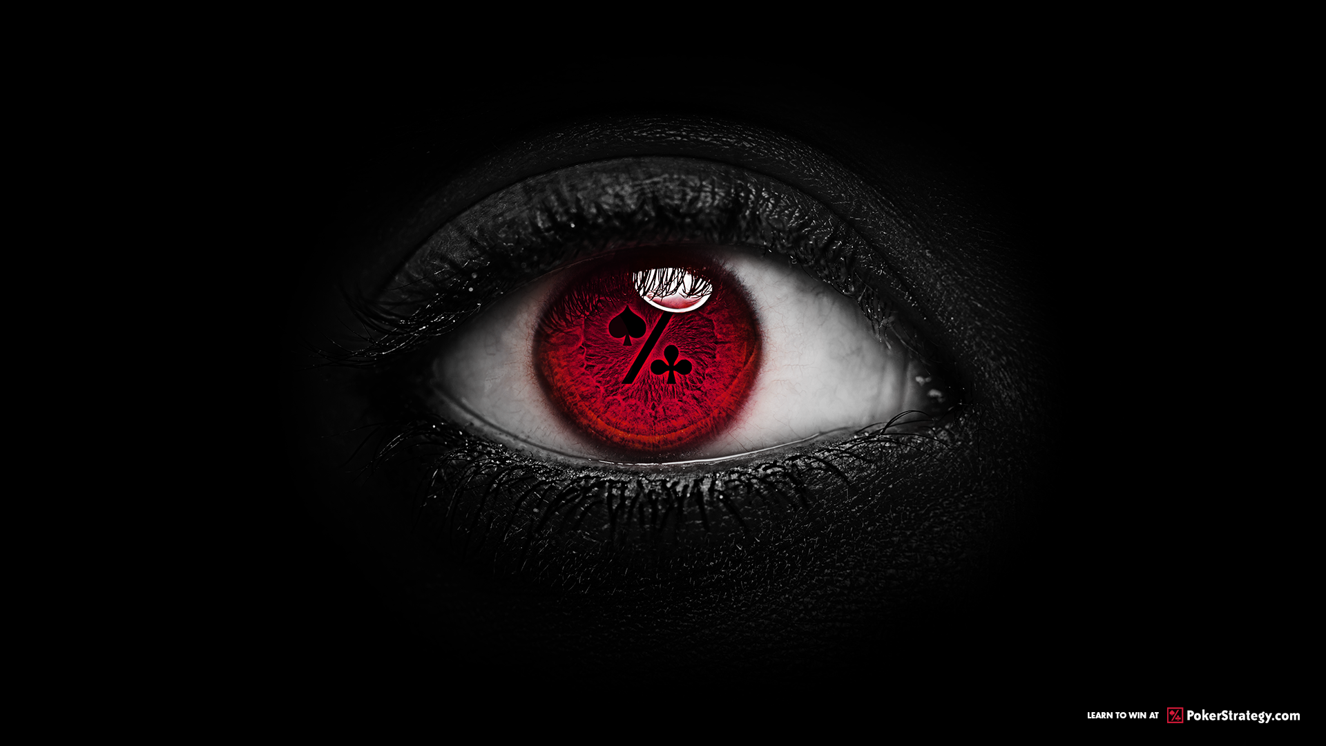Description: A red eye with a black background and a red flower in the center of the eye is a dark background.