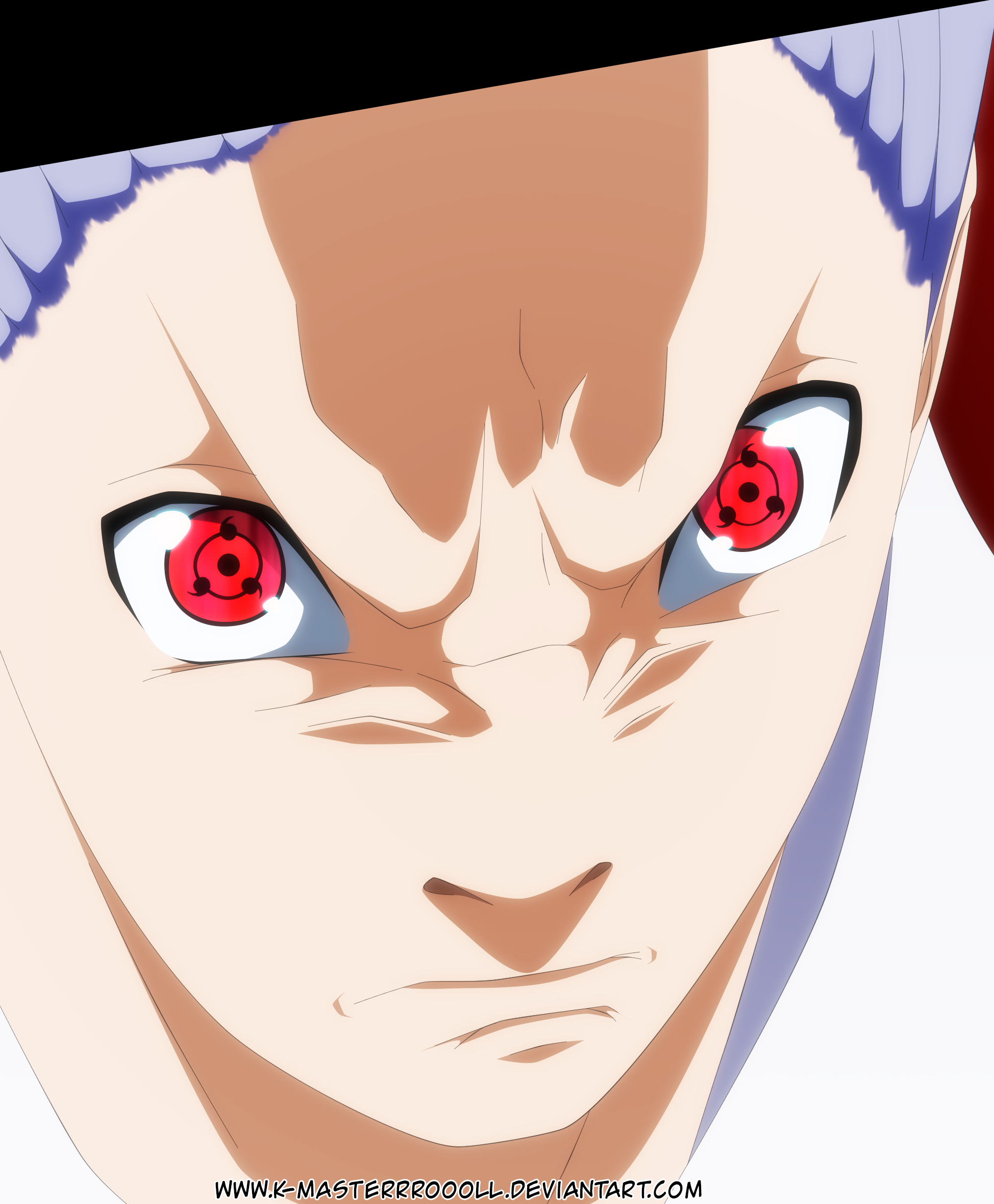 Description: A man with red eyes and a white shirt with a red eyeball on his face and a black hat on his head.