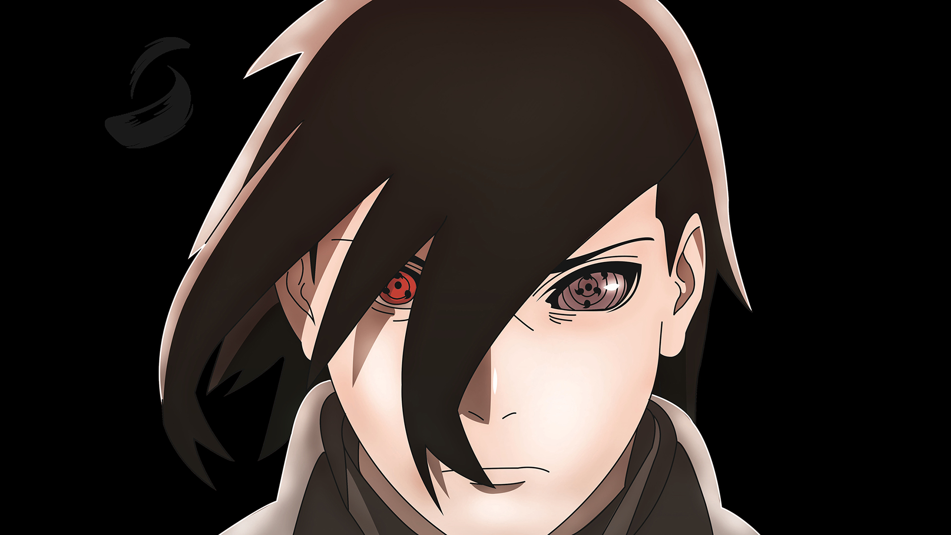 Description: A man with red eyes and a black jacket on his shoulders and a black background with a red eye.