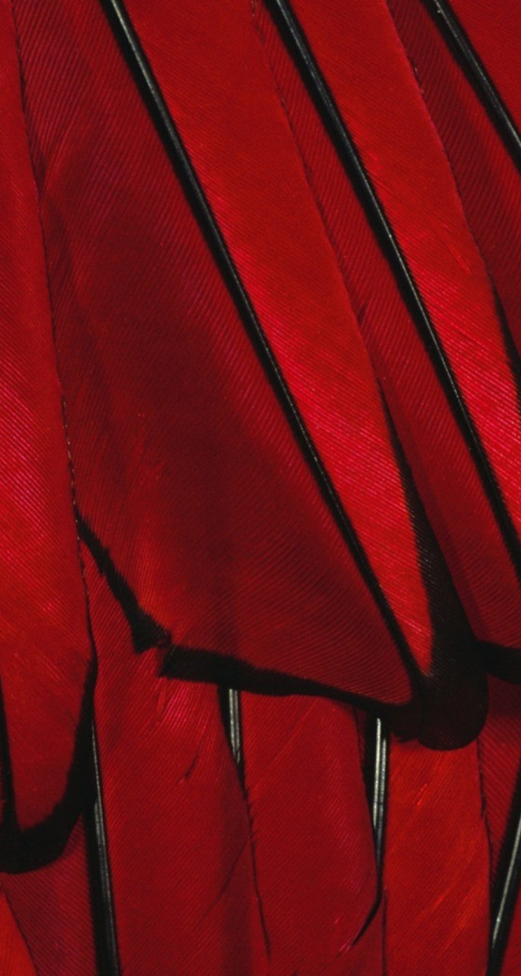 Description: A close up of a red feather with black pins on it's end and a black tip on the end of the feather.