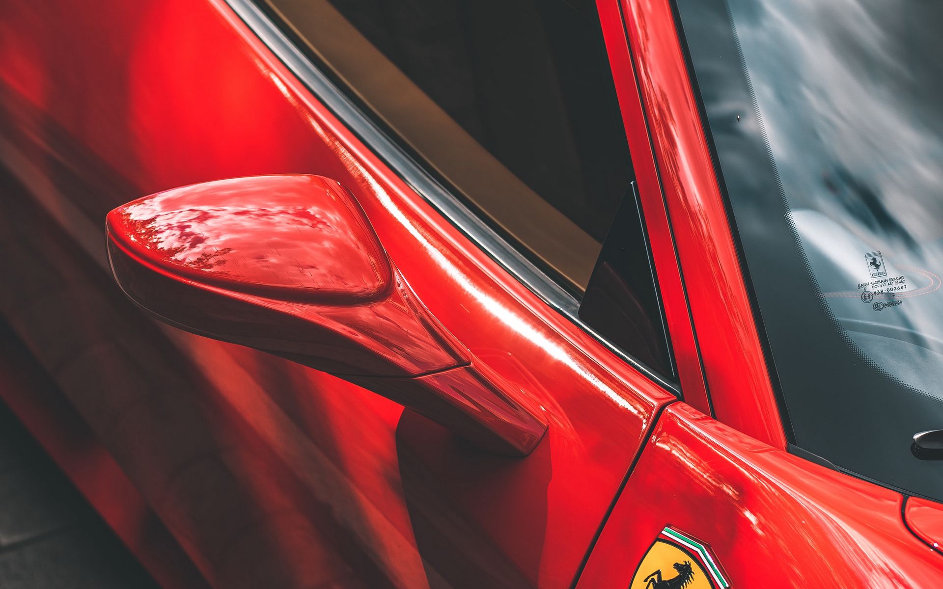 Description: A red car with a ferrari emblem on it's side window and a red car door handle with a ferrari logo on it's side window.
