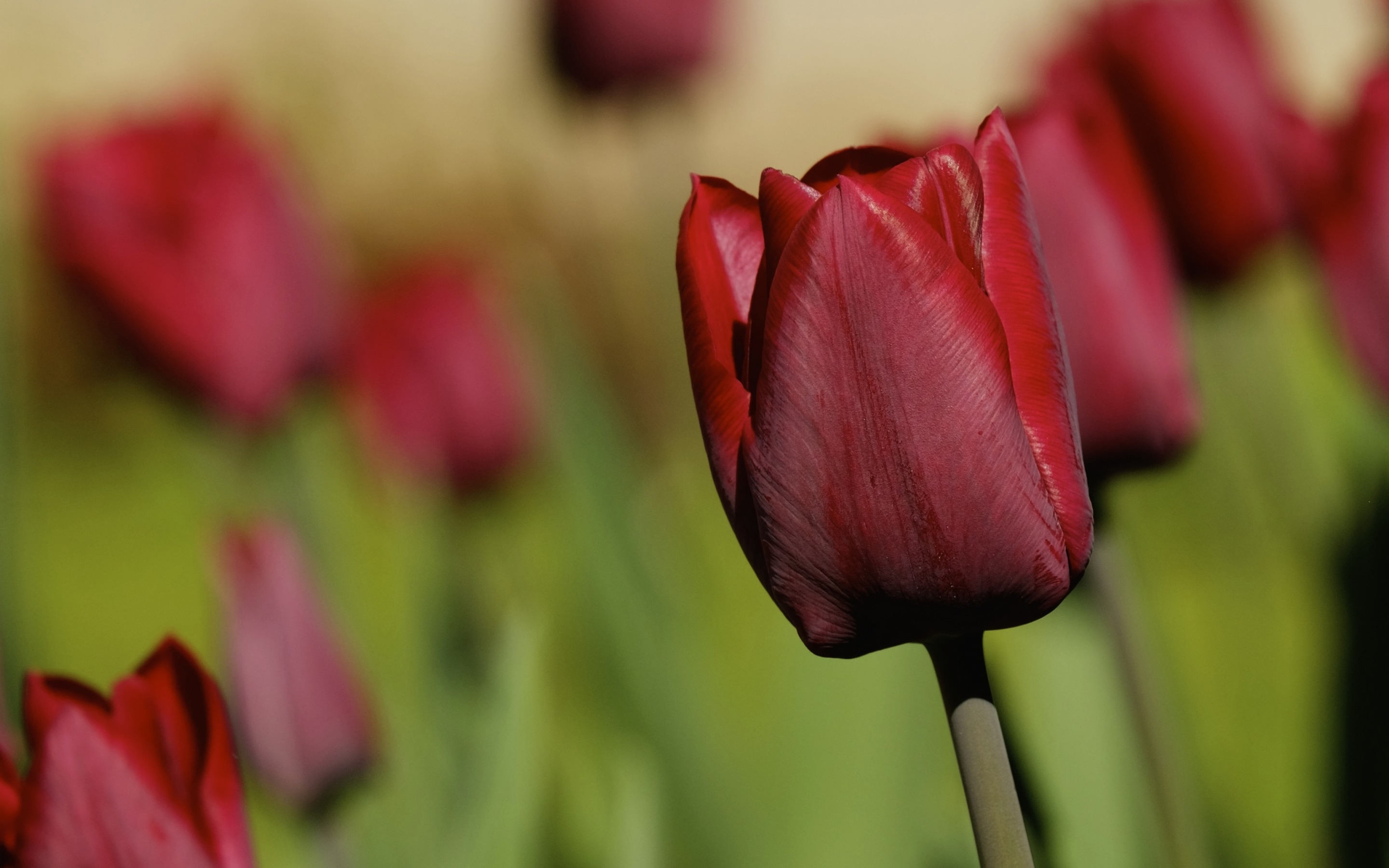 Description: A close up of a red flower with a blurry background of the petals and stems of the flowers.