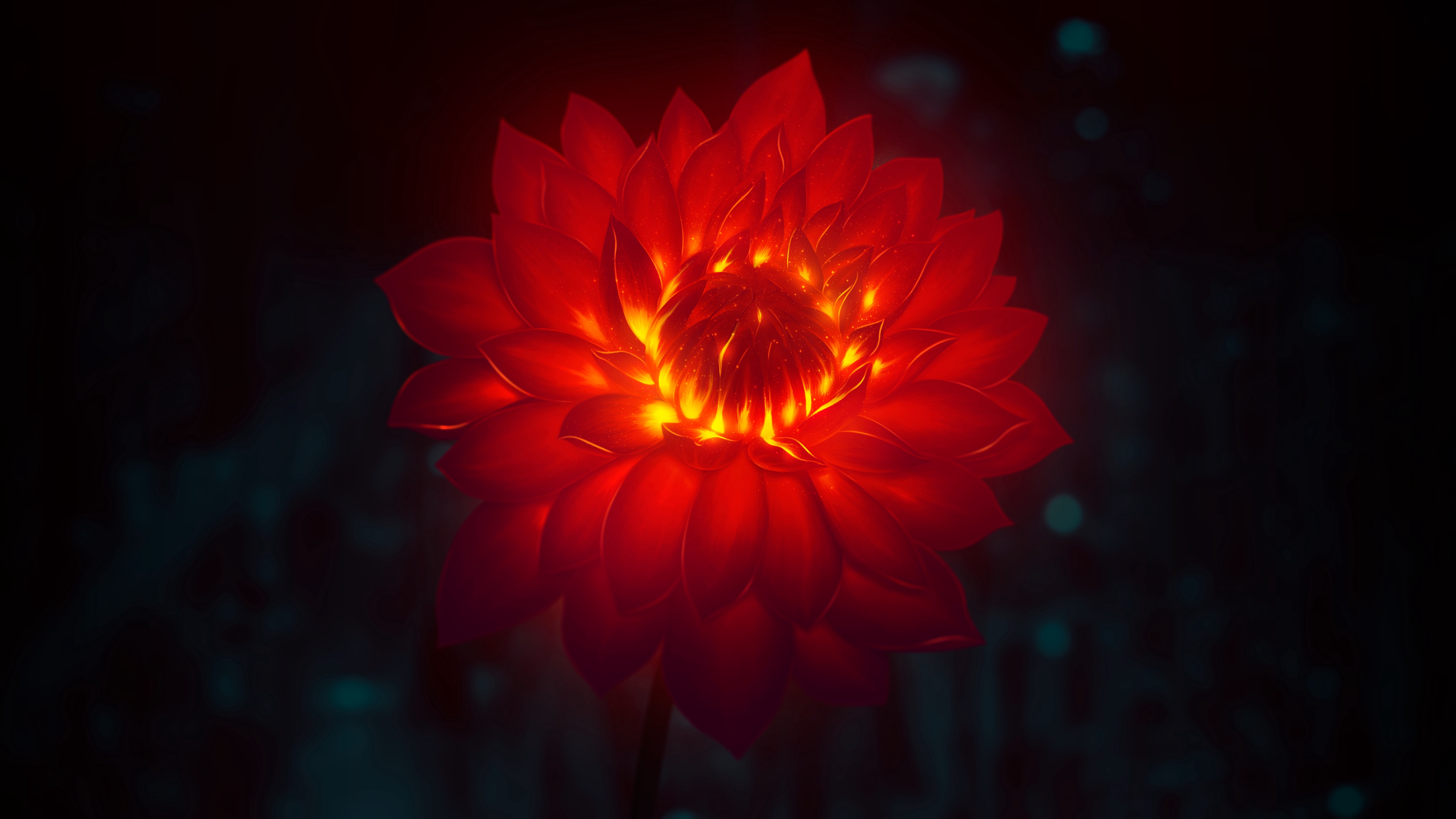 Description: A red flower with a black background and a red light in the center of it's petals is glowing.