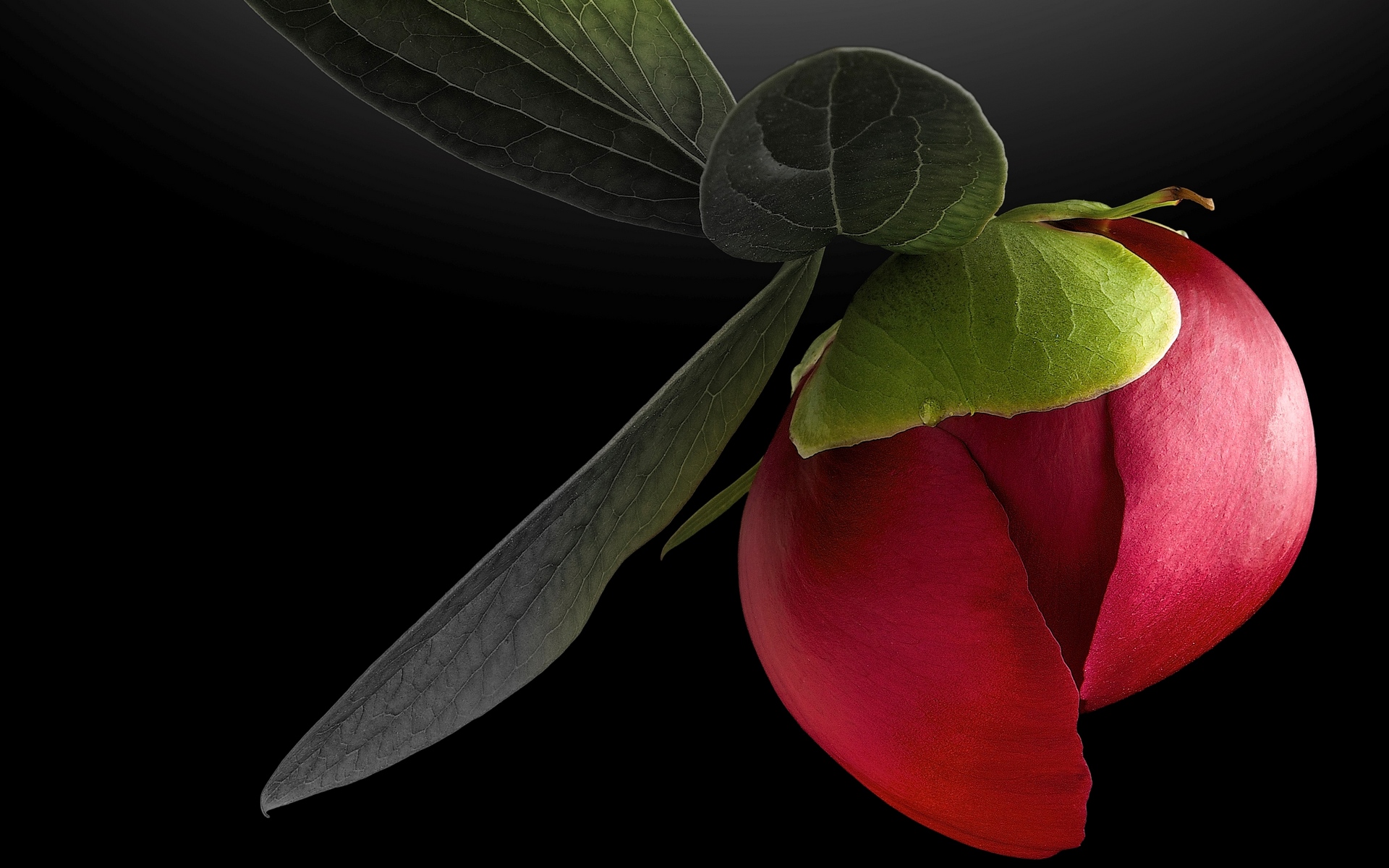 Description: A red flower with a green leaf on a black background with a black background and a black background with a black background.