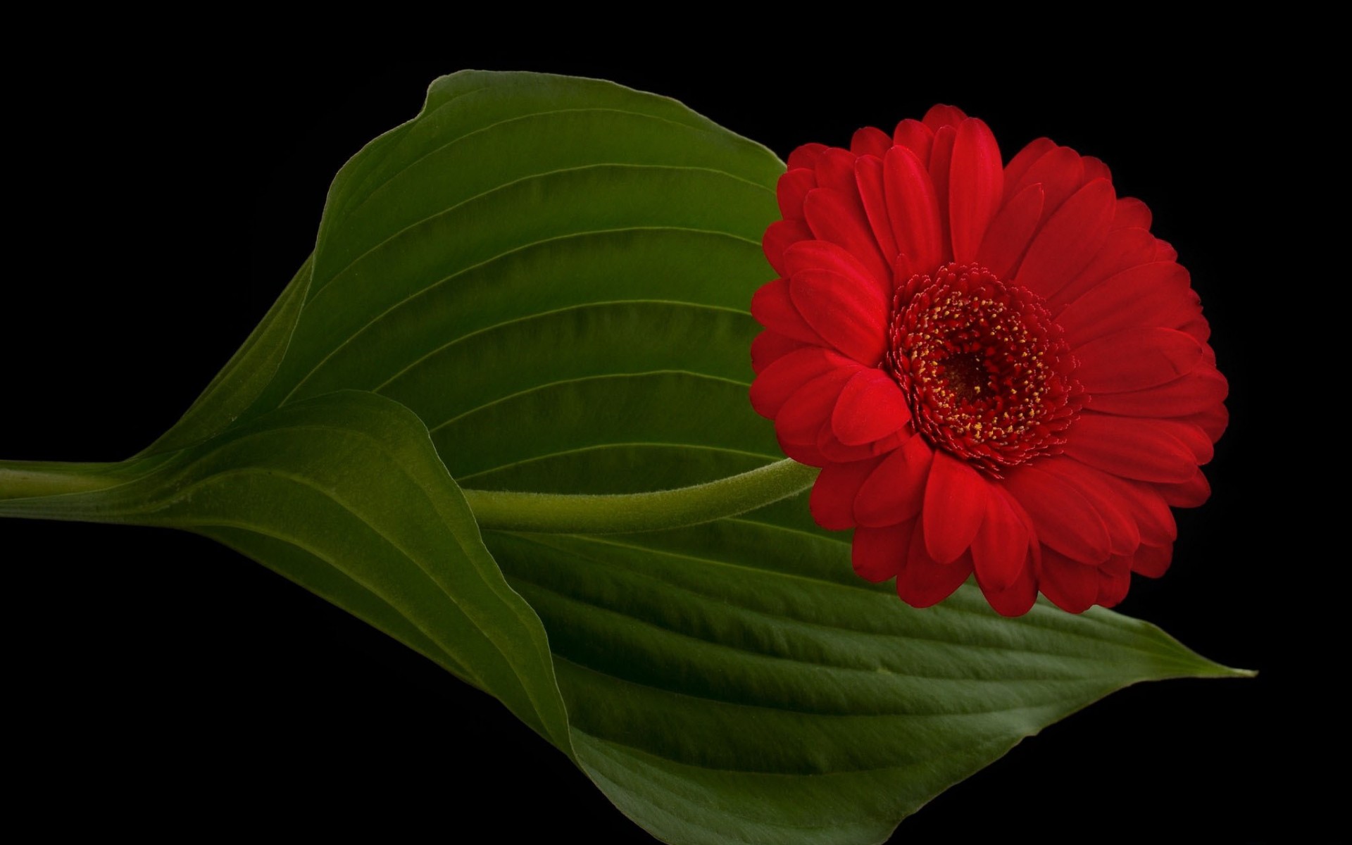 Description: A red flower with a green leaf on a black background with a black background and a black background with a red flower.