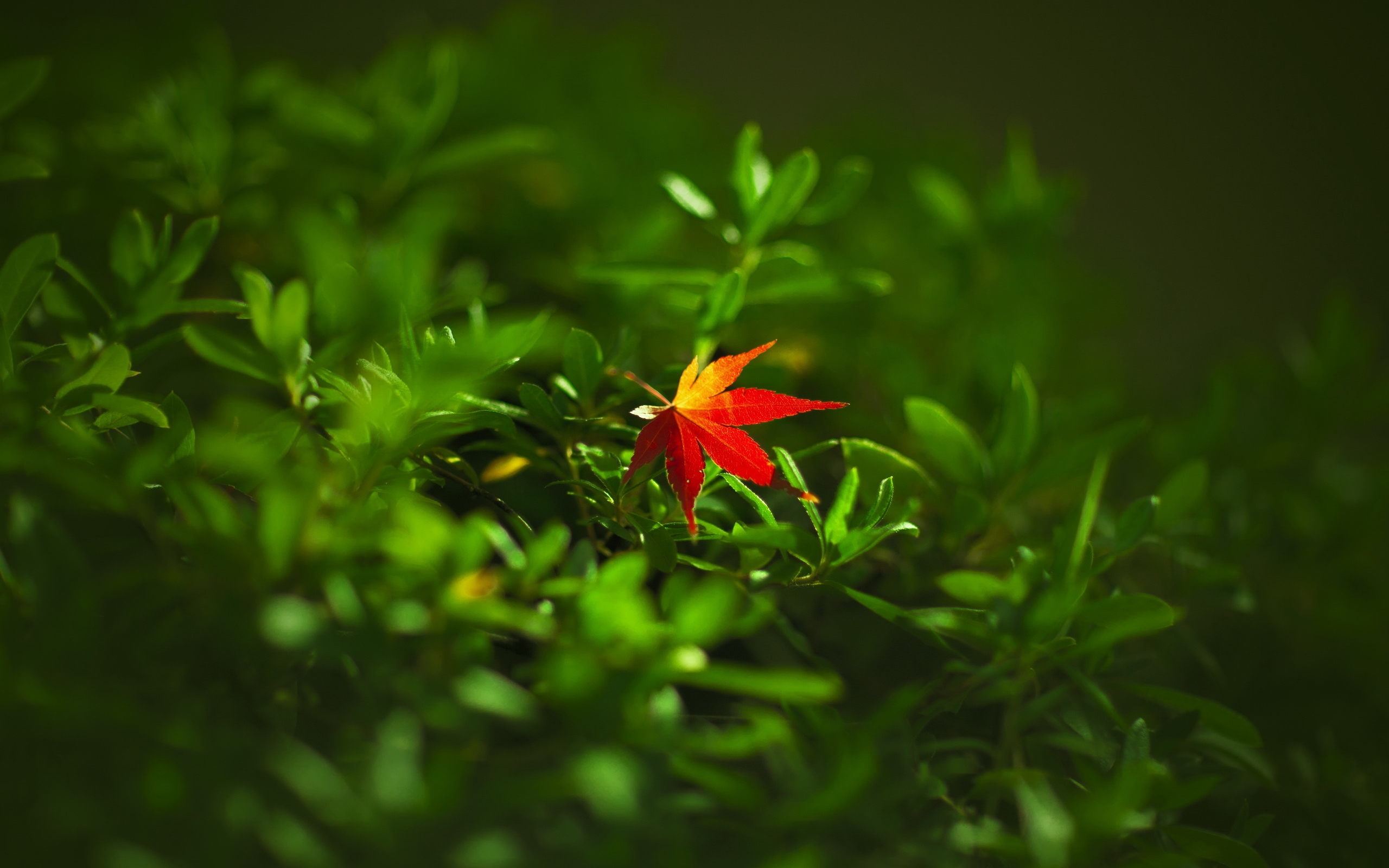 Description: A red flower is growing in the grass with green leaves around it and a dark background is in the foreground.