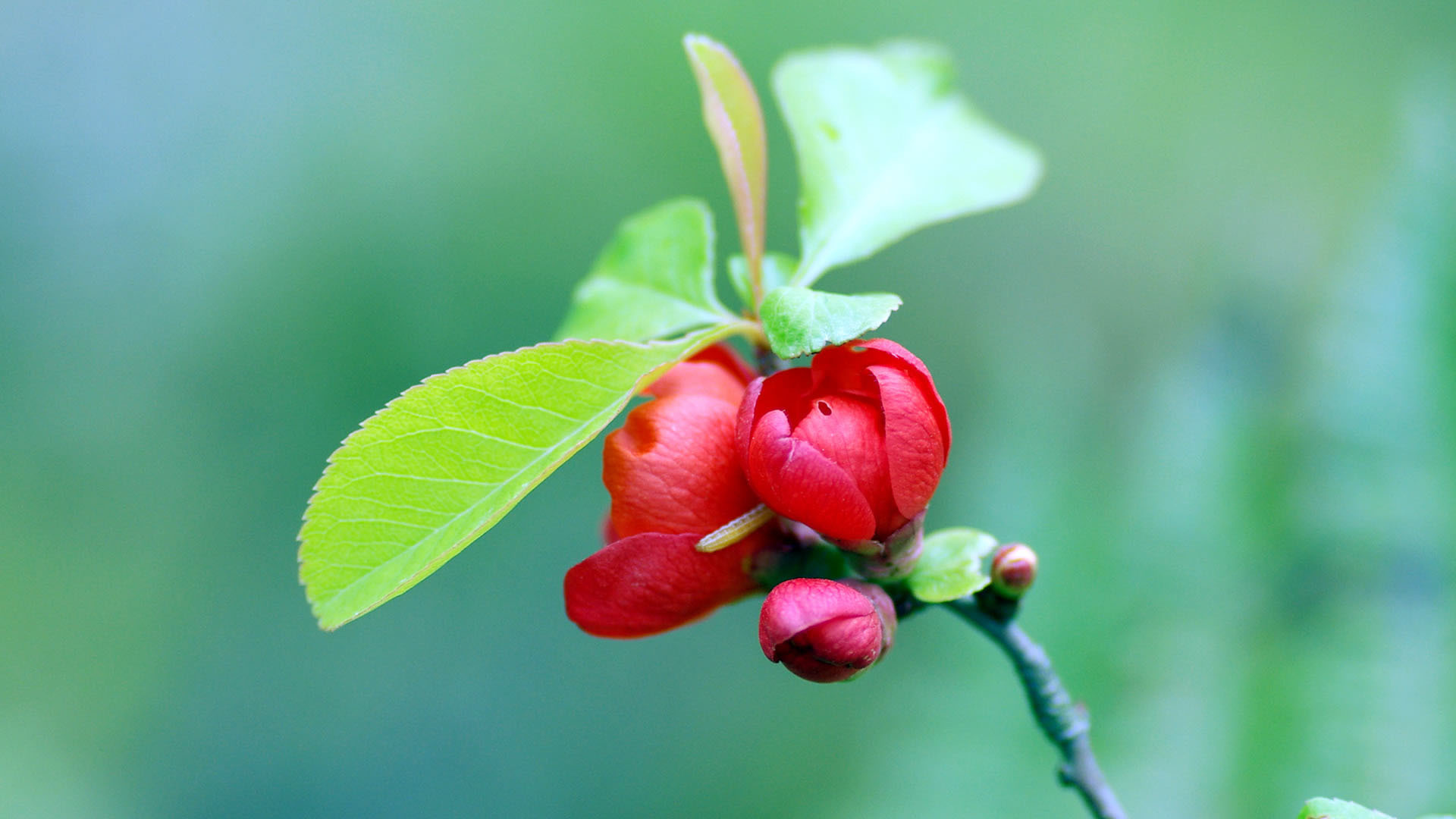 Description: A red flower with green leaves on a branch in the sun light of the day.