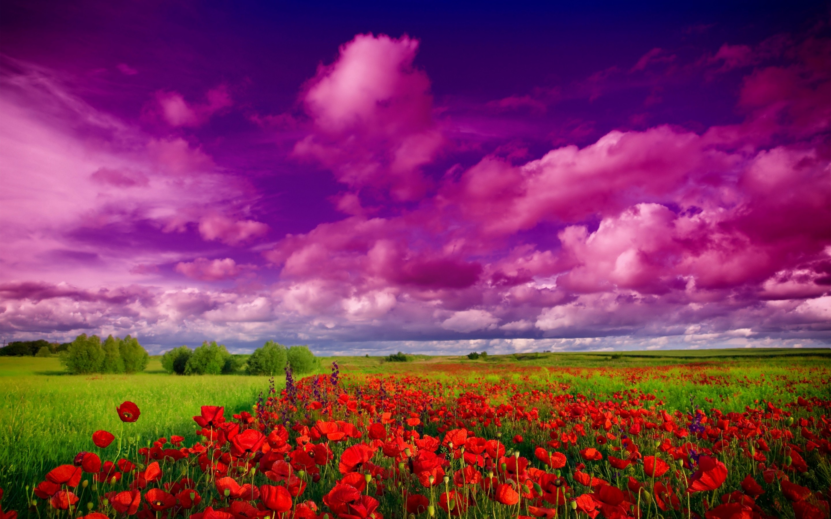 Description: A field of red flowers under a purple sky with clouds above it and a field of green grass below.