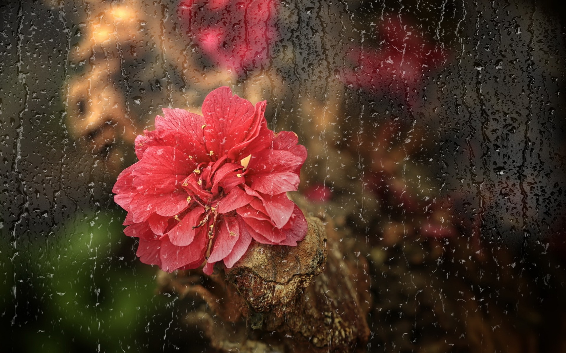 Description: A red flower sitting on top of a wooden stump in front of a window covered in rain drops of water.