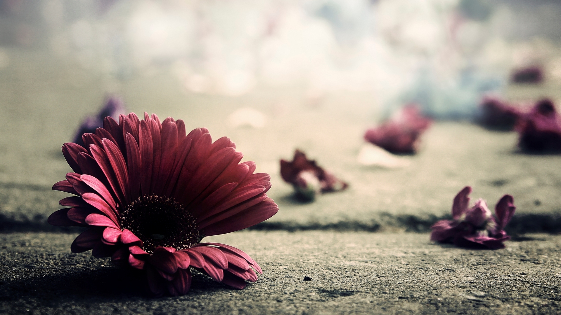 Description: A red flower sitting on the ground with petals scattered around it and a blurry background of flowers on the ground.