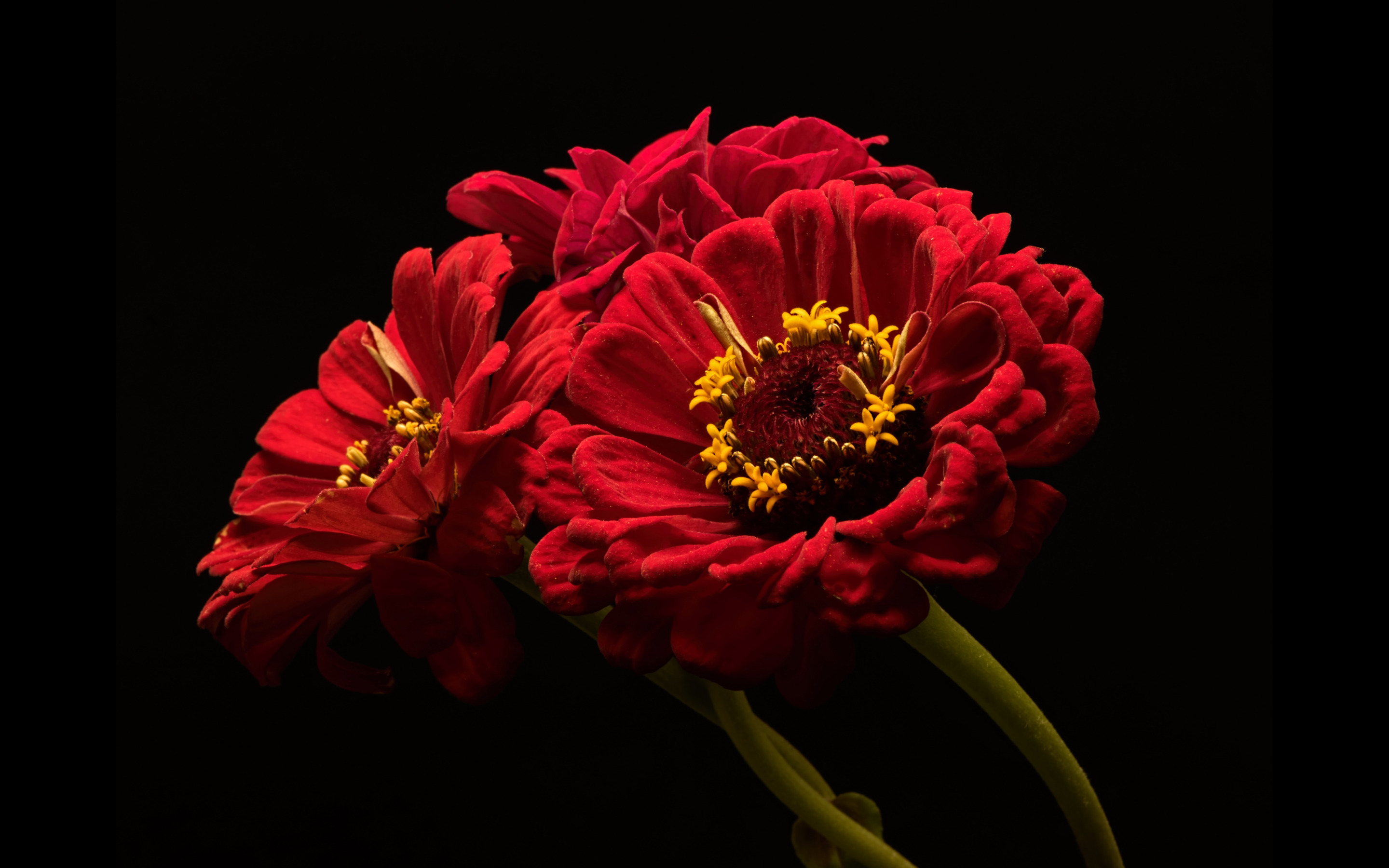 Description: Two red flowers are in a vase on a black background.