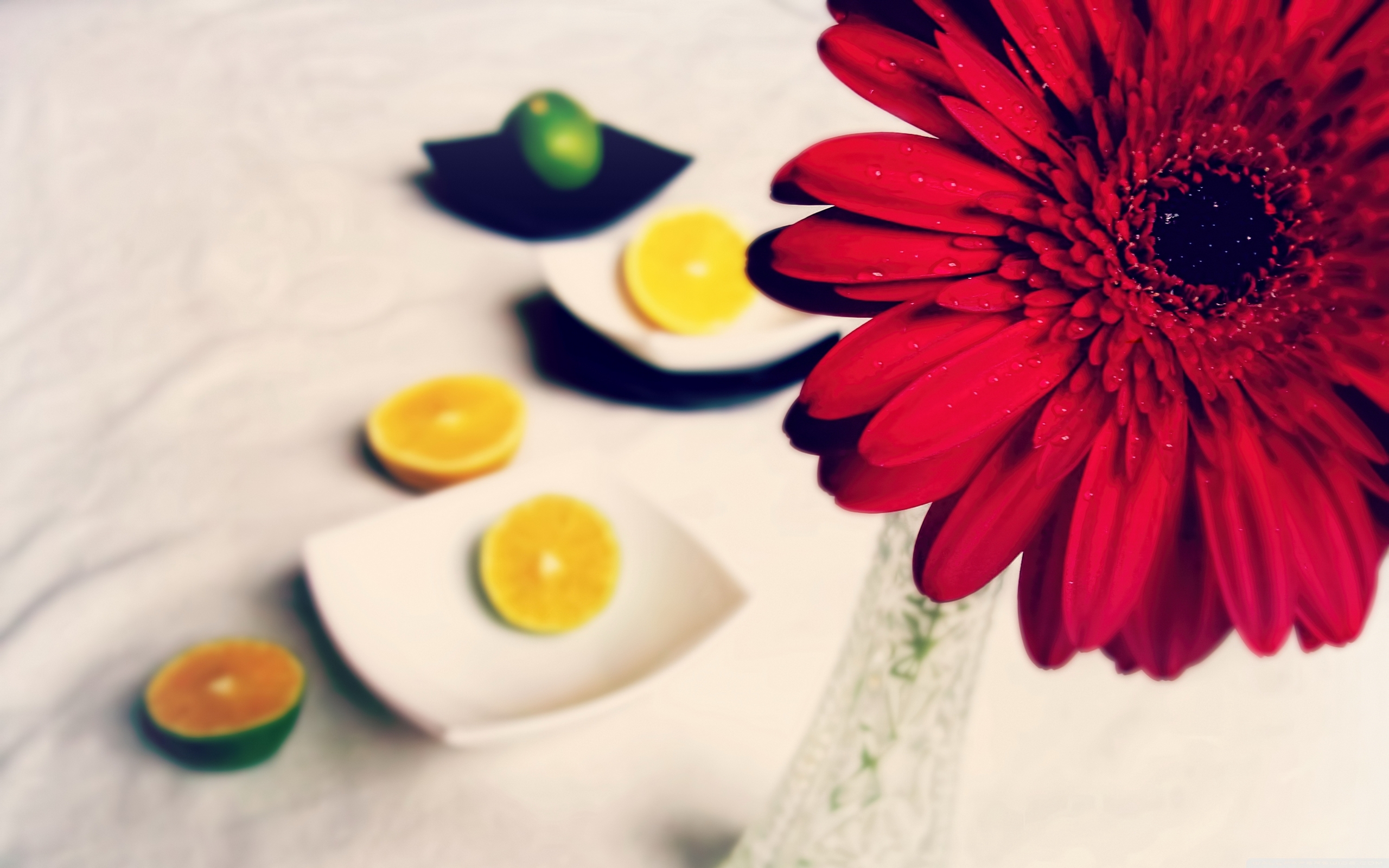 Description: A red flower sitting in a vase next to lemons and a lemon slice on a tablecloth with a white table cloth.
