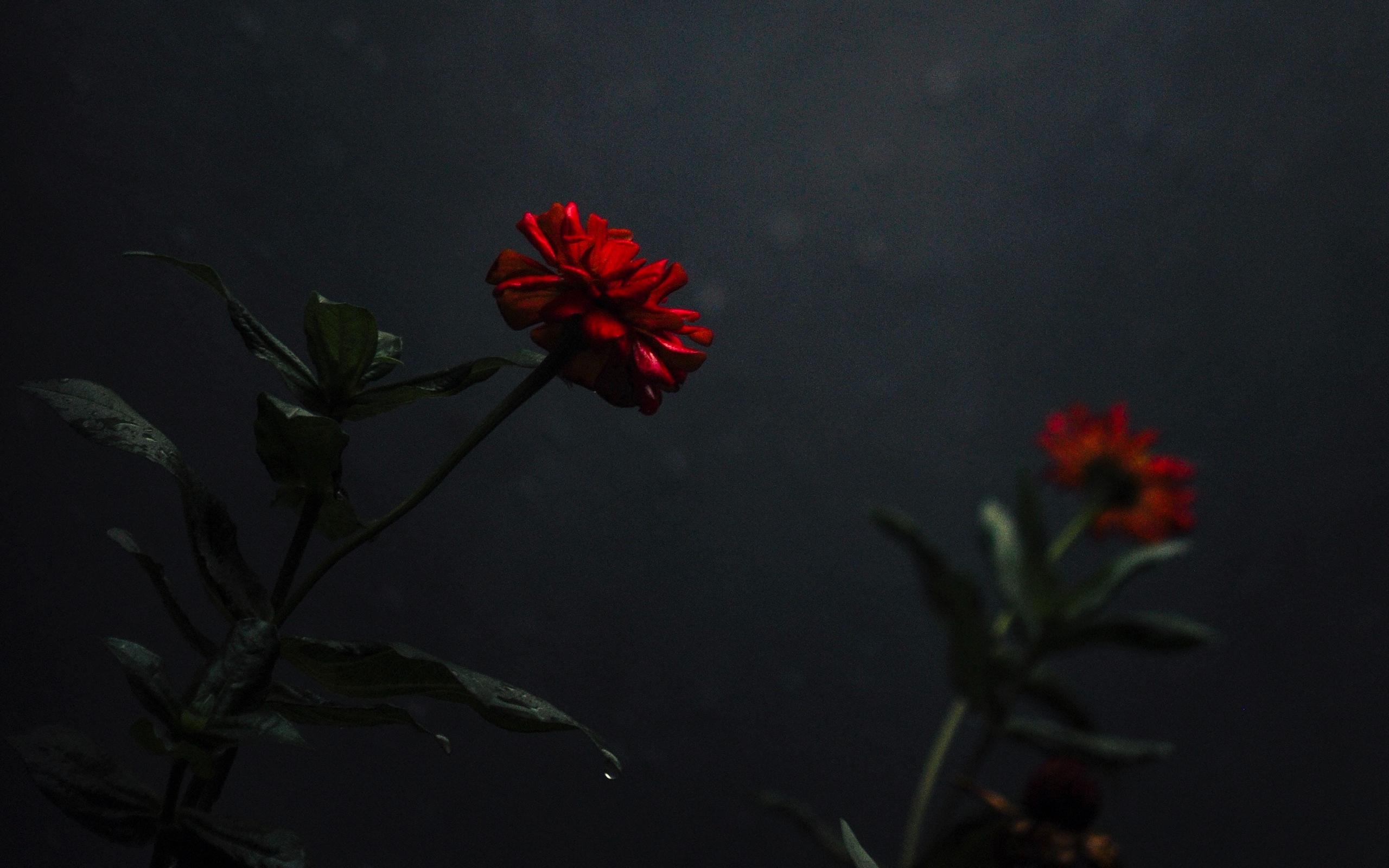 Description: A red flower is in a vase on a table with a dark background and a black background behind it.